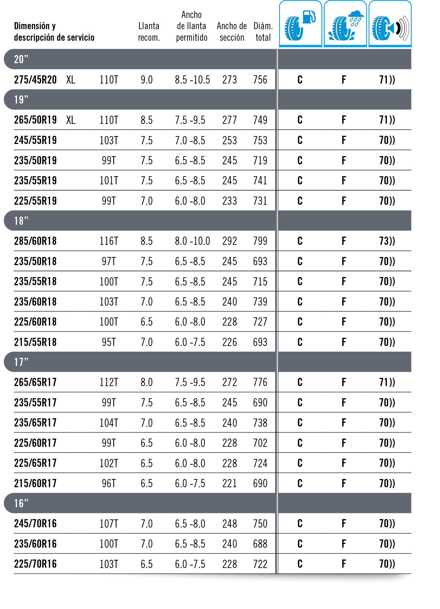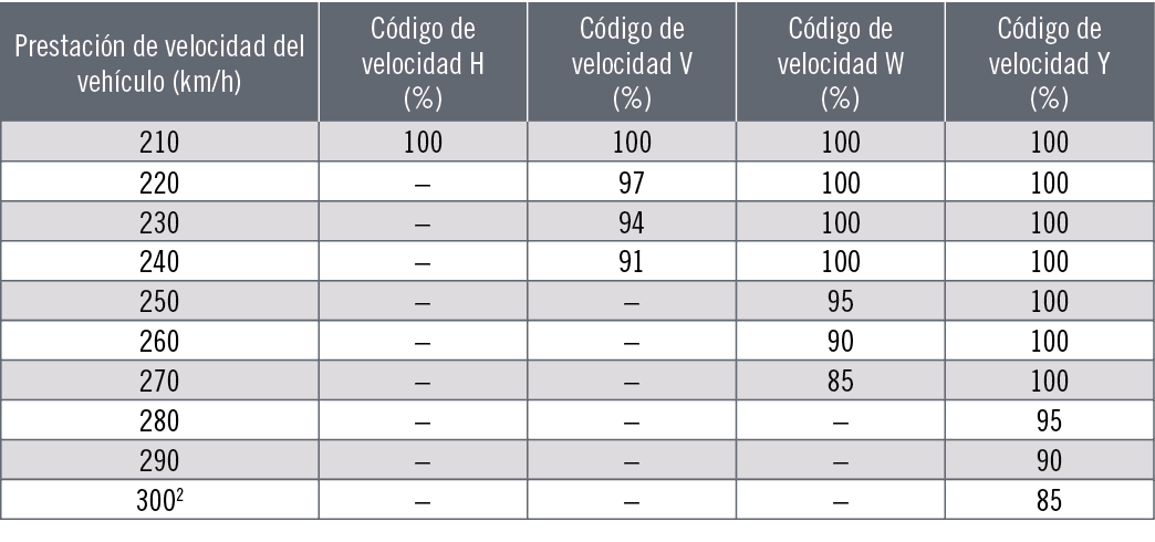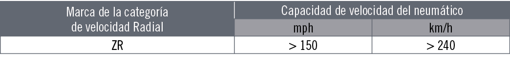 Índice de carga. El índice de carga es un código numérico referido a la carga máxima que un neumático puede soportar a una determinada velocidad (indicada por su símbolo de velocidad) de acuerdo con las condiciones de servicio especificadas por el fabricante. Código de velocidad. El código de velocidad indica la velocidad a la que el neumático puede soportar la carga equivalente a su índice de carga de acuerdo con las condiciones de servicio especificadas por el fabricante (excepto para velocidades superiores a los 210 km/h; consulte la siguiente tabla de capacidades de carga relacionadas con la velocidad). Categoría de velocidad. Las marcas de la categoría de velocidad que se muestran a continuación indican las prestaciones de velocidad del neumático a más de 240 km/h, y se incluyen dentro de la indicación del tamaño del neumático; por ejemplo, 225/50 ZR 16. Generalmente, la descripción del servicio no se muestra en estos neumáticos. Para prestaciones de velocidad y capacidades de carga reales, consulte al fabricante del neumático respectivo. Los neumáticos para velocidades superiores a 240 km/h se pueden marcar provisionalmente con “ZR” junto con la descripción del servicio neumático (por ejemplo, 195/50 ZR 15 82W, 195/50 ZR 15 82Y). Si no hay descripción del servicio, consulte al fabricante del neumático para conocer la velocidad máxima real y la capacidad de carga pertinente. Todas las velocidades que se muestran en las tablas se aplican a neumáticos en buenas condiciones, inflados con la presión correcta, que funcionan con su capacidad de carga específica y que están montados en una llanta del tamaño correcto. Las velocidades expuestas corresponden a la velocidad máxima que el vehículo puede alcanzar, no a la velocidad normal de circulación.