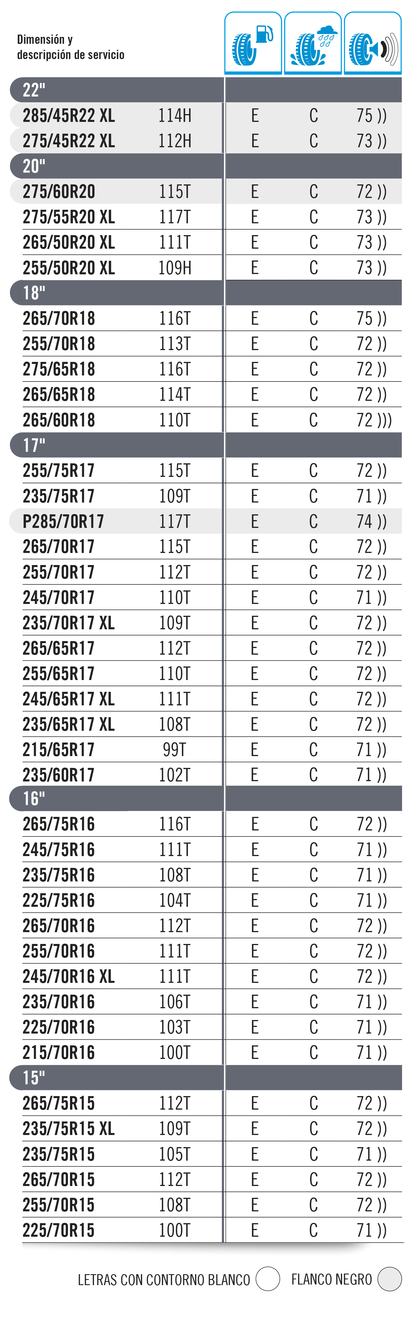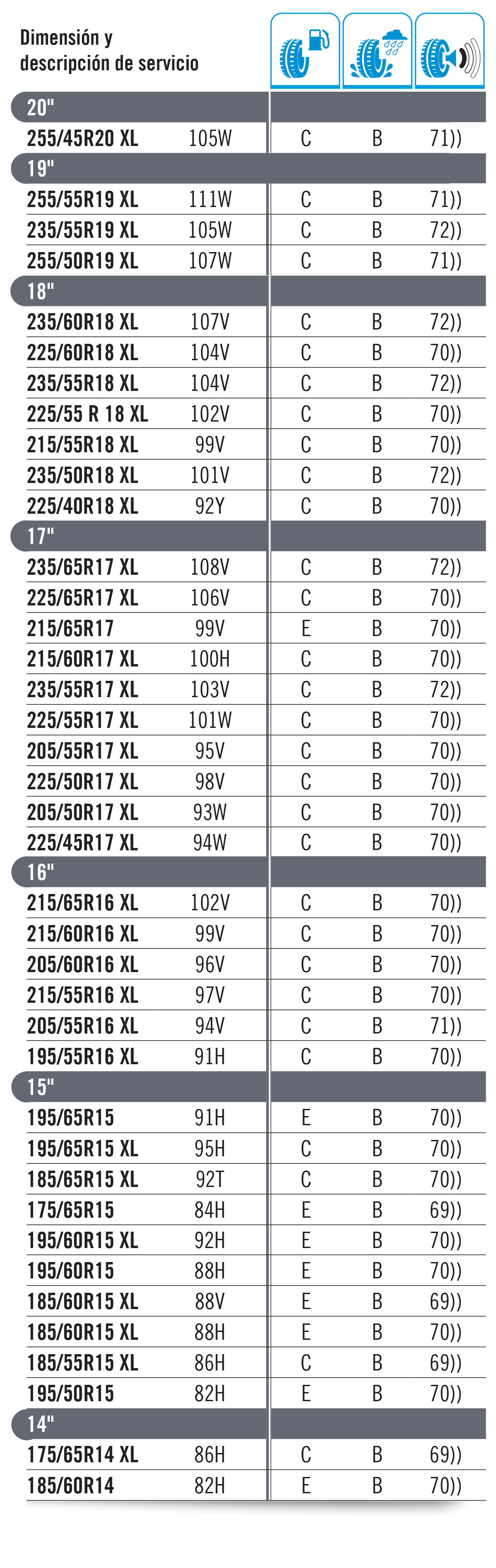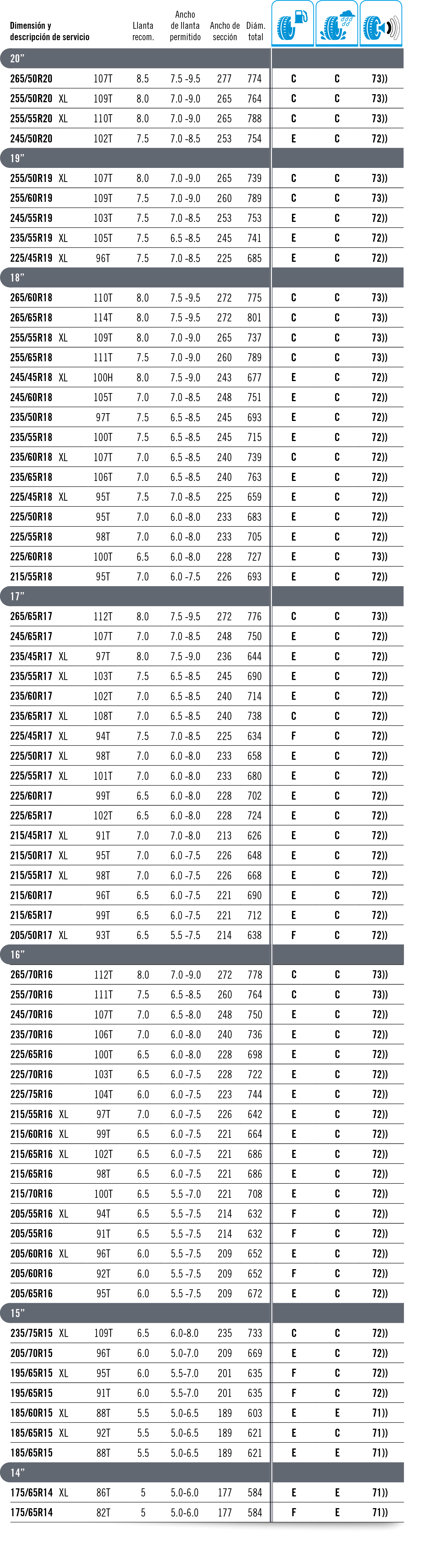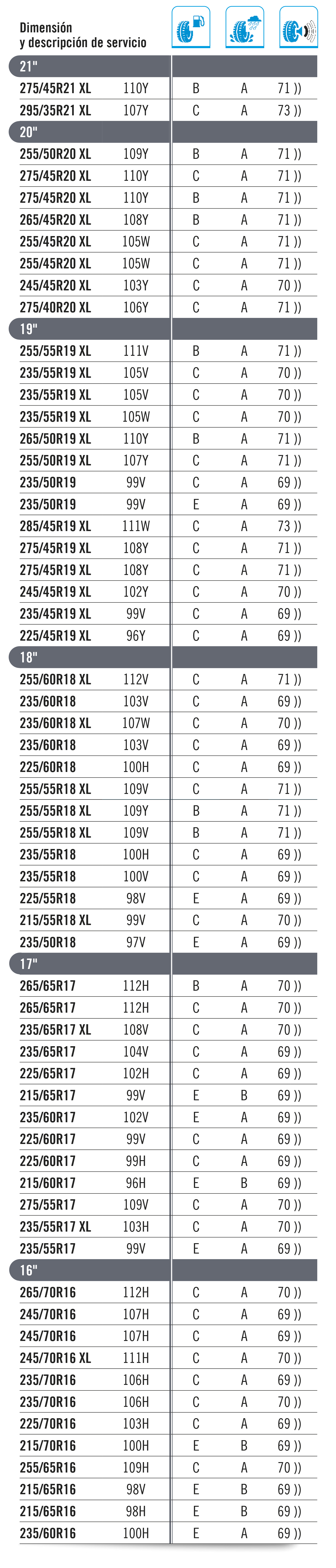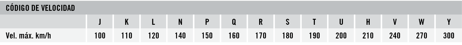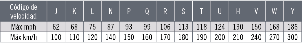 La carga máxima que puede soportar un neumático se establece como “índice de carga”. Este baremo se indica con un código numérico, tal y como se muestra en la tabla inferior. El código de velocidad se muestra con una letra que marca la velocidad máxima a la que es seguro utilizar el neumático. Importante: La carga máxima para neumáticos con códigos V, W e Y debe reducirse hasta un 15 % para velocidades por encima de los 210 km/h (V), 240 km/h (W) y los 270 km/h (Y).