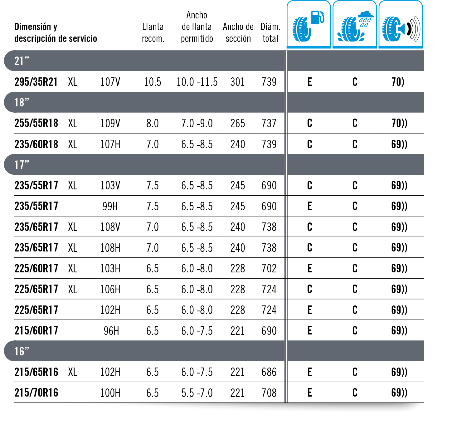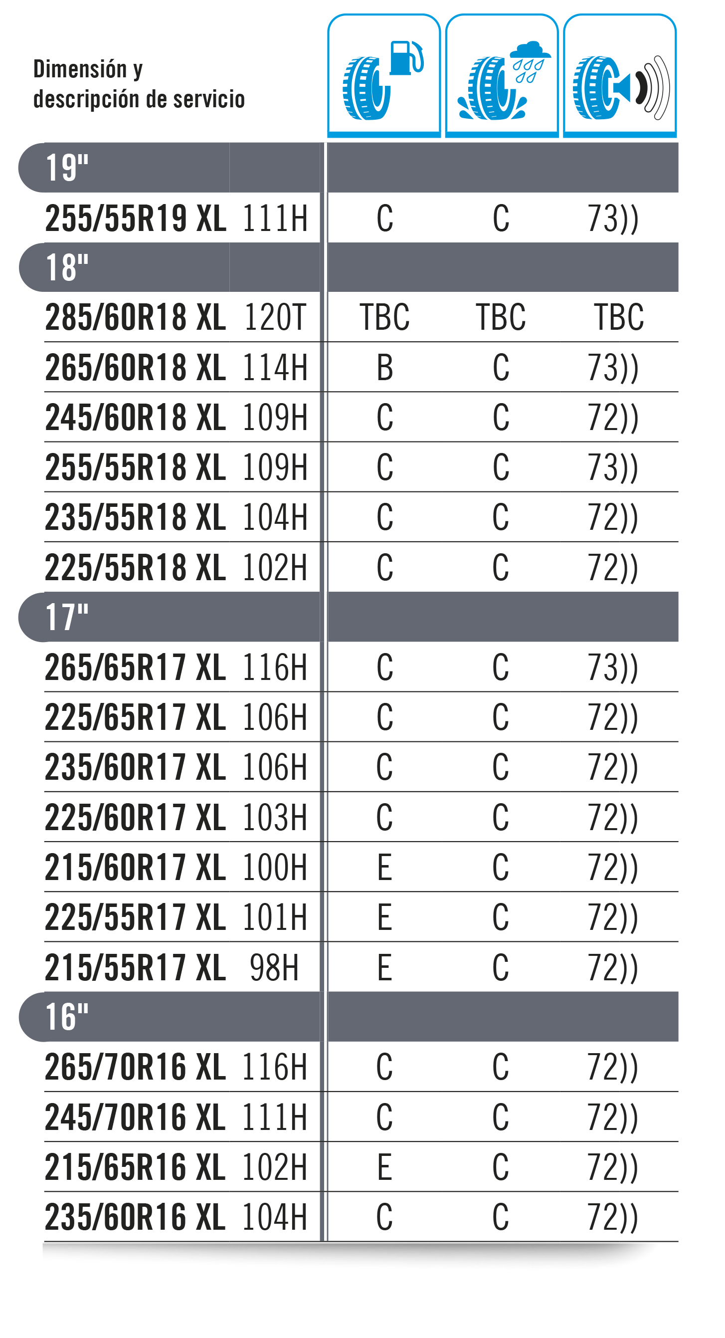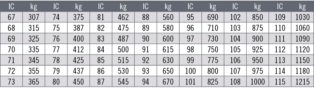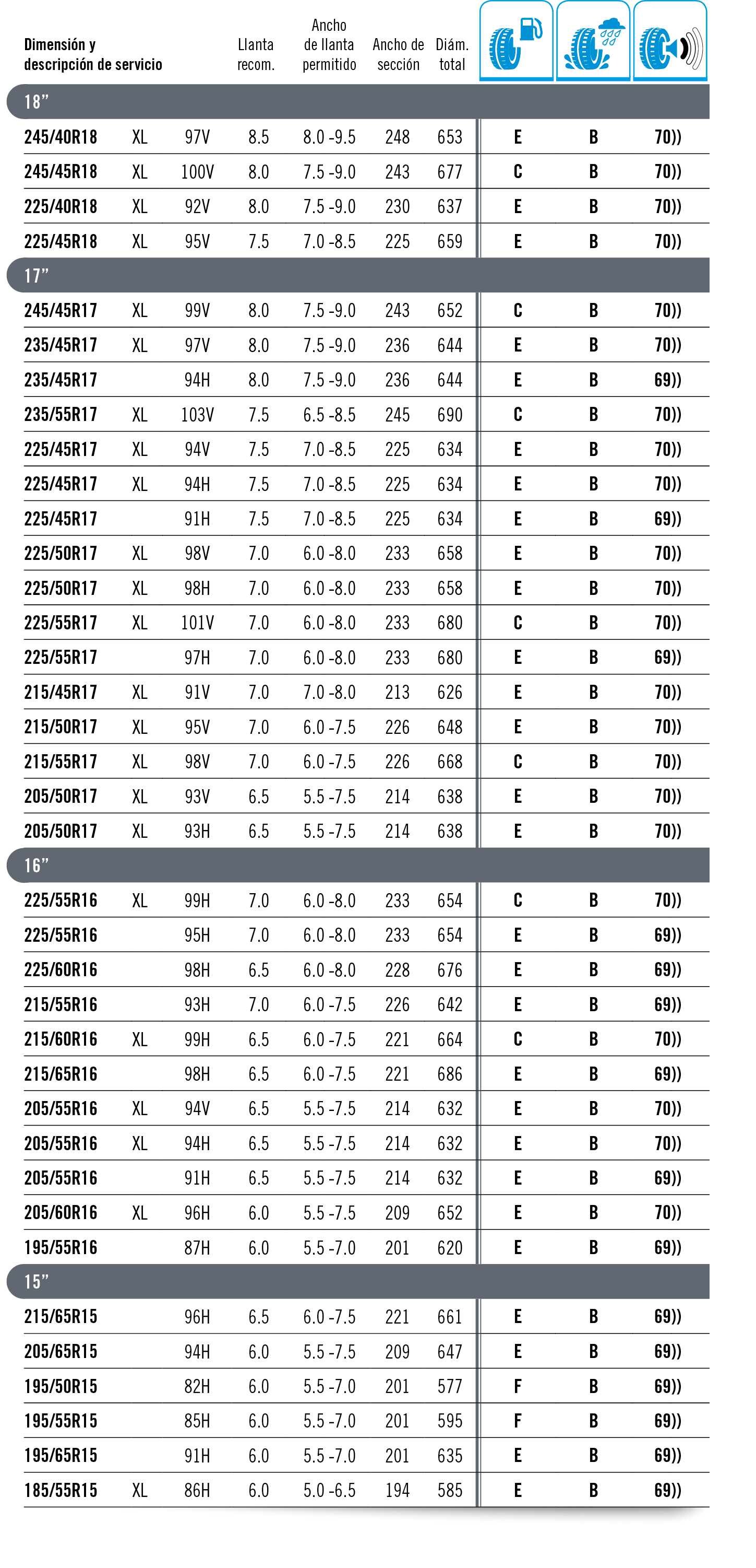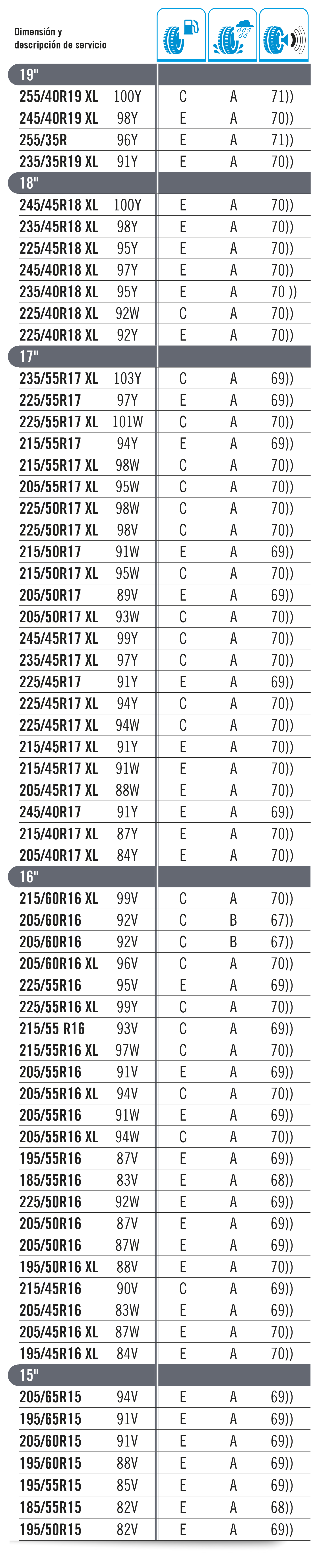 La carga máxima que puede soportar un neumático se establece como “índice de carga”. Este baremo se indica con un código numérico, tal y como se muestra en la tabla inferior. El código de velocidad se muestra con una letra que marca la velocidad máxima a la que es seguro utilizar el neumático. Importante: La carga máxima para neumáticos con códigos V, W e Y debe reducirse hasta un 15 % para velocidades por encima de los 210 km/h (V), 240 km/h (W) y los 270 km/h (Y).