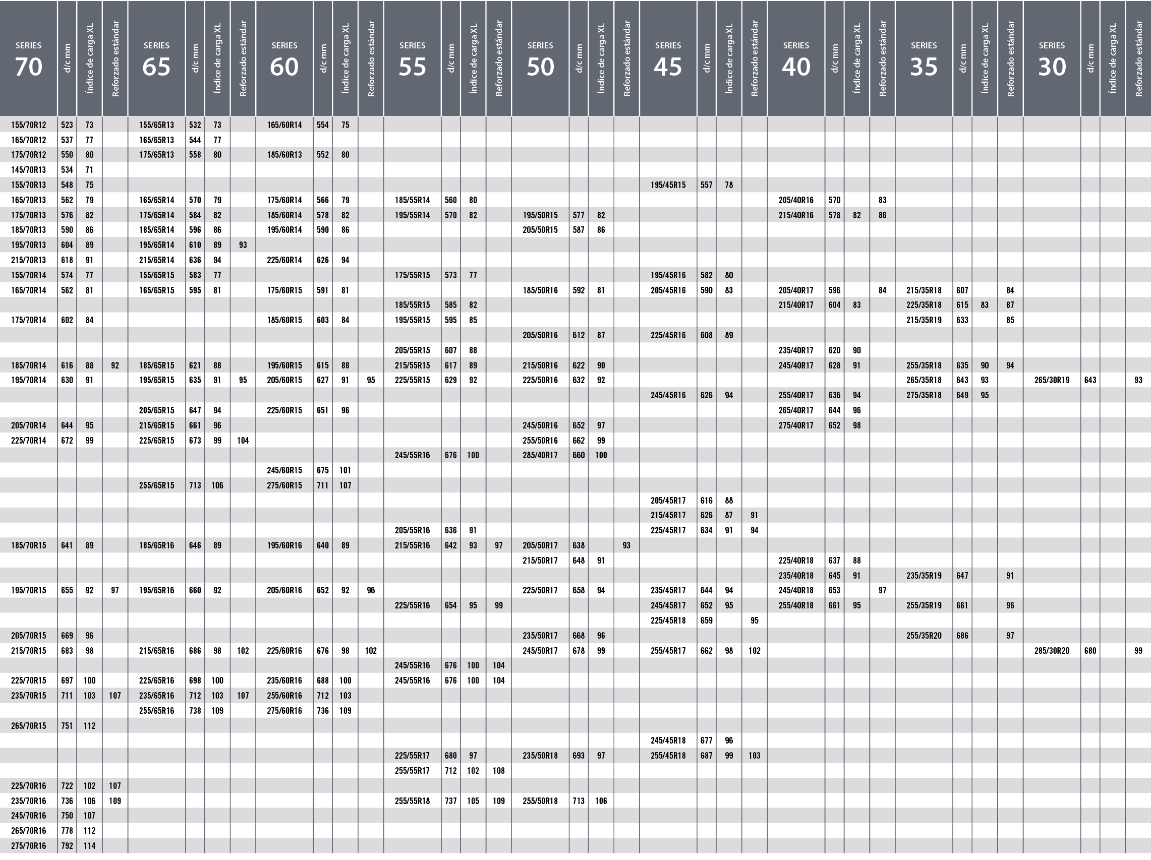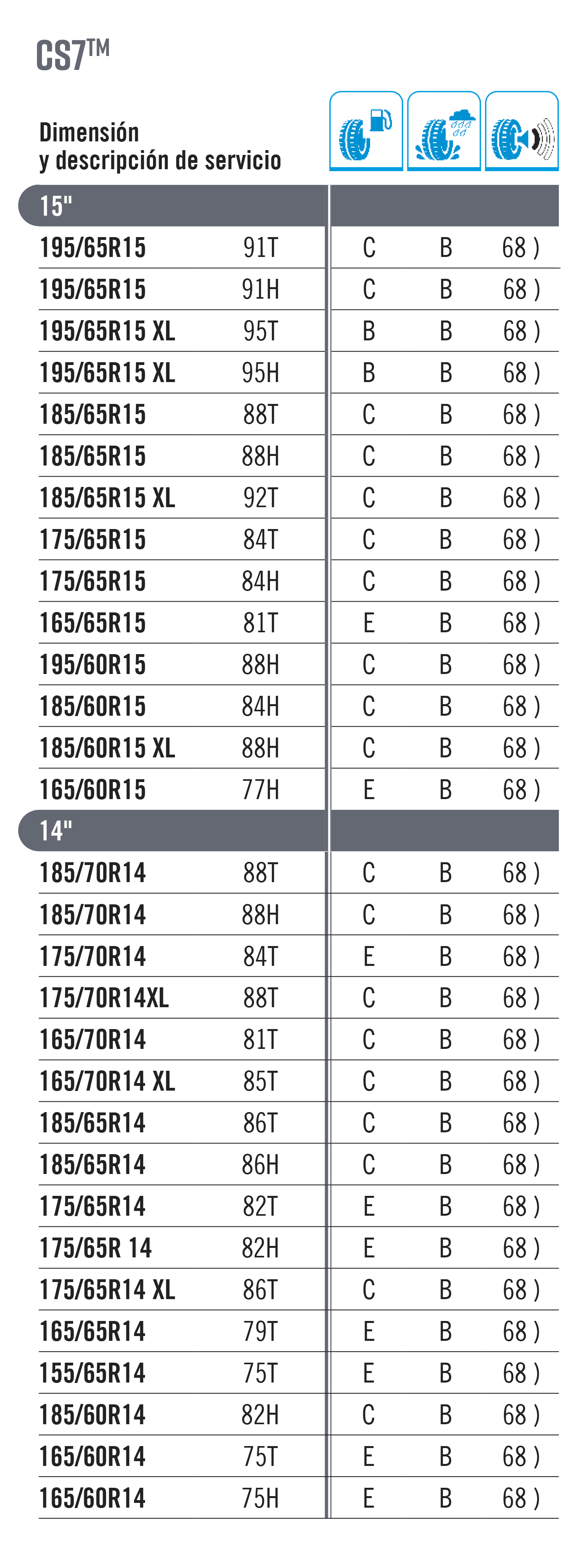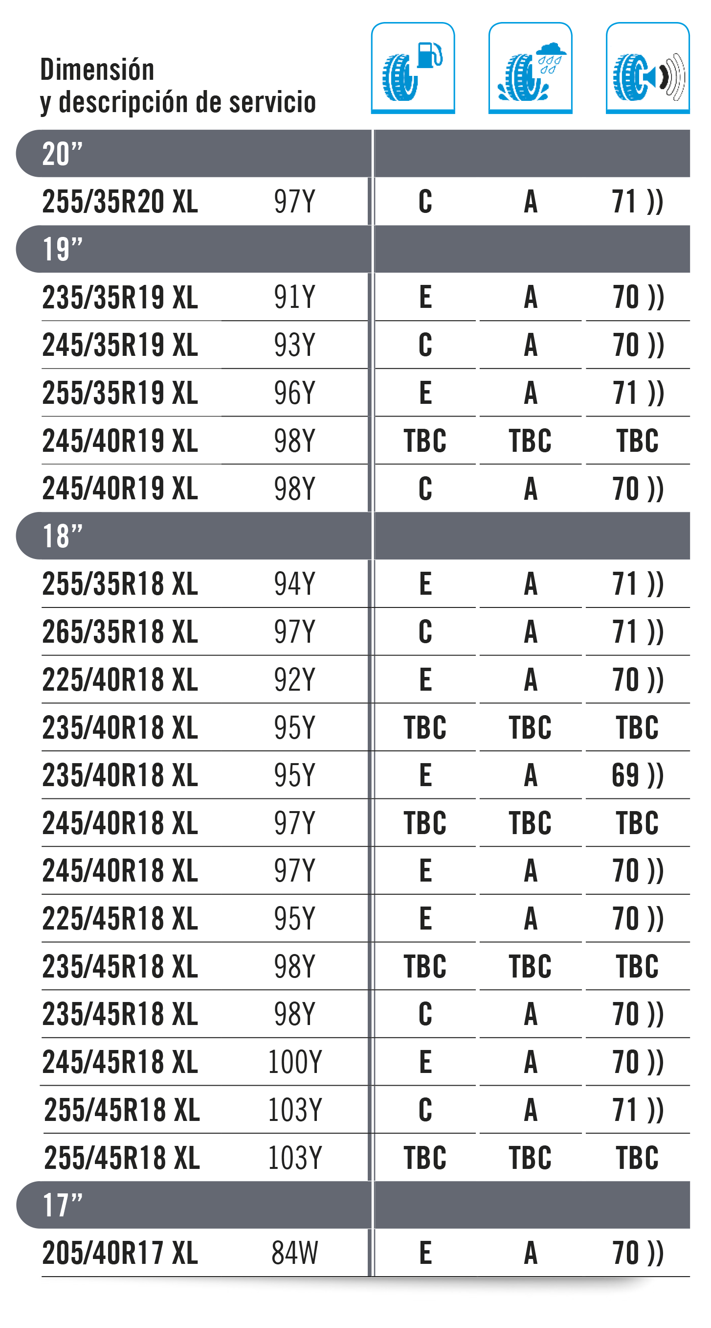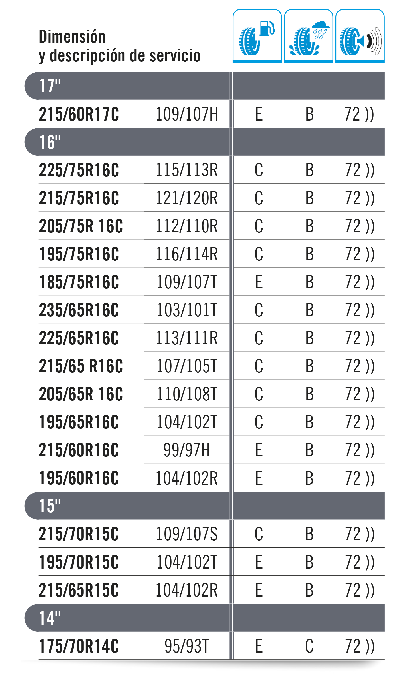 La carga máxima que puede soportar un neumático se establece como “índice de carga”. Este baremo se indica con un código numérico, tal y como se muestra en la tabla inferior. El código de velocidad se muestra con una letra que marca la velocidad máxima a la que es seguro utilizar el neumático. Importante: La carga máxima para neumáticos con códigos V, W e Y debe reducirse hasta un 15 % para velocidades por encima de los 210 km/h (V), 240 km/h (W) y los 270 km/h (Y).