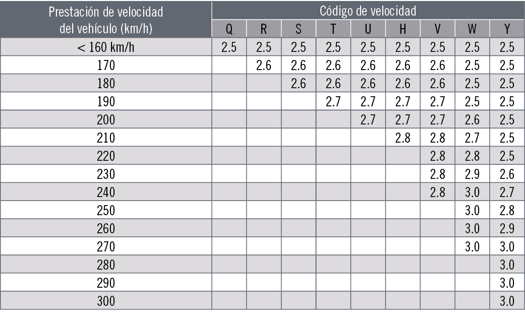1.- En velocidades máximas intermedias, se permite la interpolación lineal de la capacidad de carga del neumático. 2.- Para prestaciones de velocidad superiores a 300 km/h, el porcentaje de la capacidad de carga y las presiones de inflado pertinentes deben ser las indicadas por los fabricantes de los vehículos y los neumáticos (o las asociaciones de fabricantes nacionales) teniendo en cuenta las características de los vehículos y el tipo de servicio.