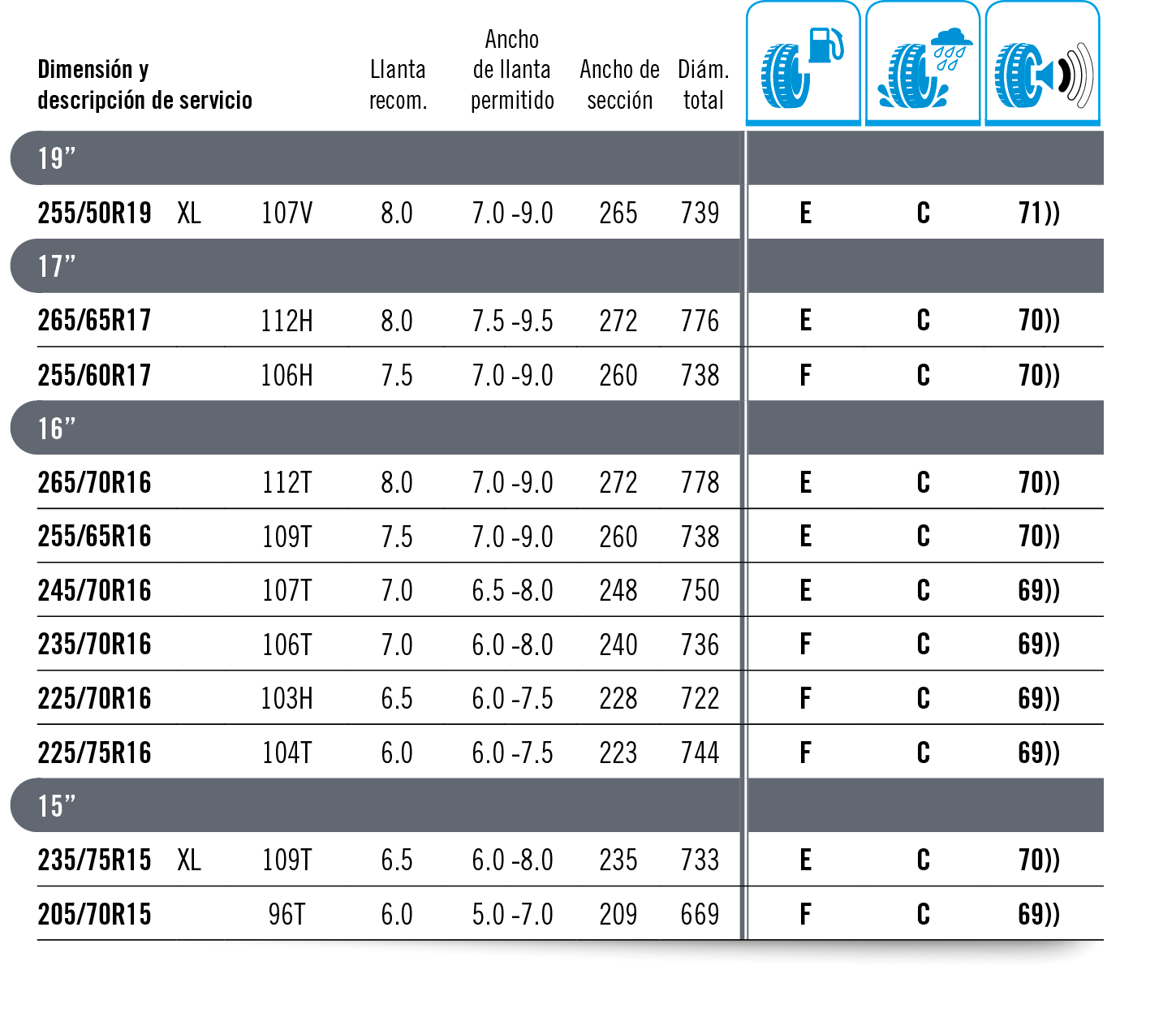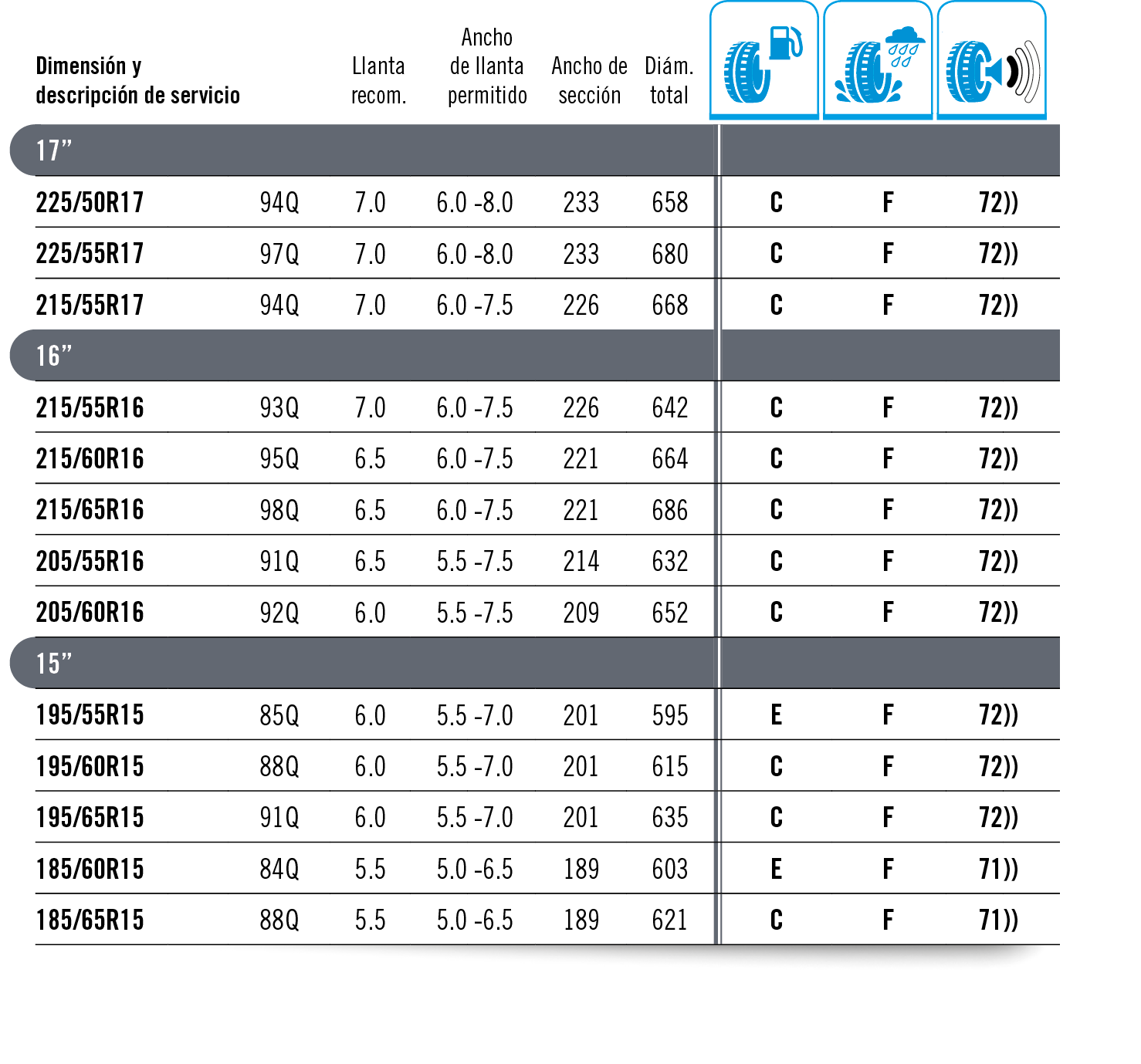 Indicación de la dimensióndel neumático