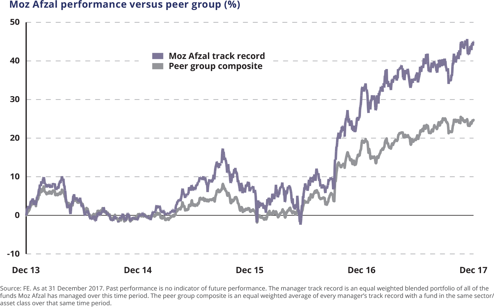 Source: FE. As at 31 December 2017. Past performance is no indicator of future performance. The manager track record is an equal weighted blended portfolio of all of the funds Moz Afzal has managed over this time period. The peer group composite is an equal weighted average of every manager’s track record with a fund in the same sector/asset class over that same time period.