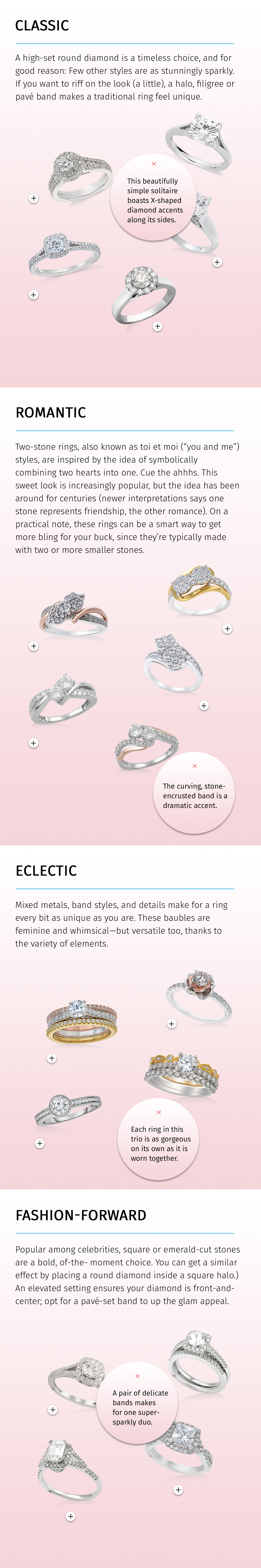 A high-set round diamond is a timeless choice and for good reason: Few styles are as stunningly sparkly. If you're looking to turn things up a notch, a halo, filigree or pavé band makes a traditional ring feel unique. unique.