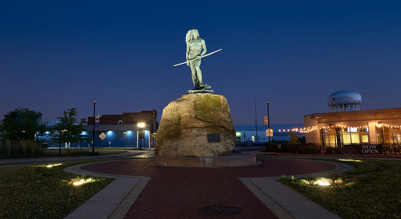 A downtown revitalization project in Muncie, Indiana, included the revamping and enlargement of a roundabout at Walnut and Seymour Streets. The center of the roundabout features an imposing statue called "The Passing of the Buffalo," the focal point of this location since 2007. Upon completion of the road work and landscaping, the city saw the opportunity to better showcase the sculpture with illumination.