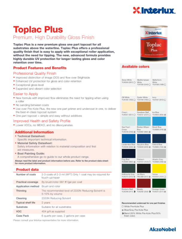 Toplac Plus provides a best in class high gloss finish with longer lasting UV protection that is easy to apply with exceptional roller application, without the need for tipping, available in a full range of vibrant colors.