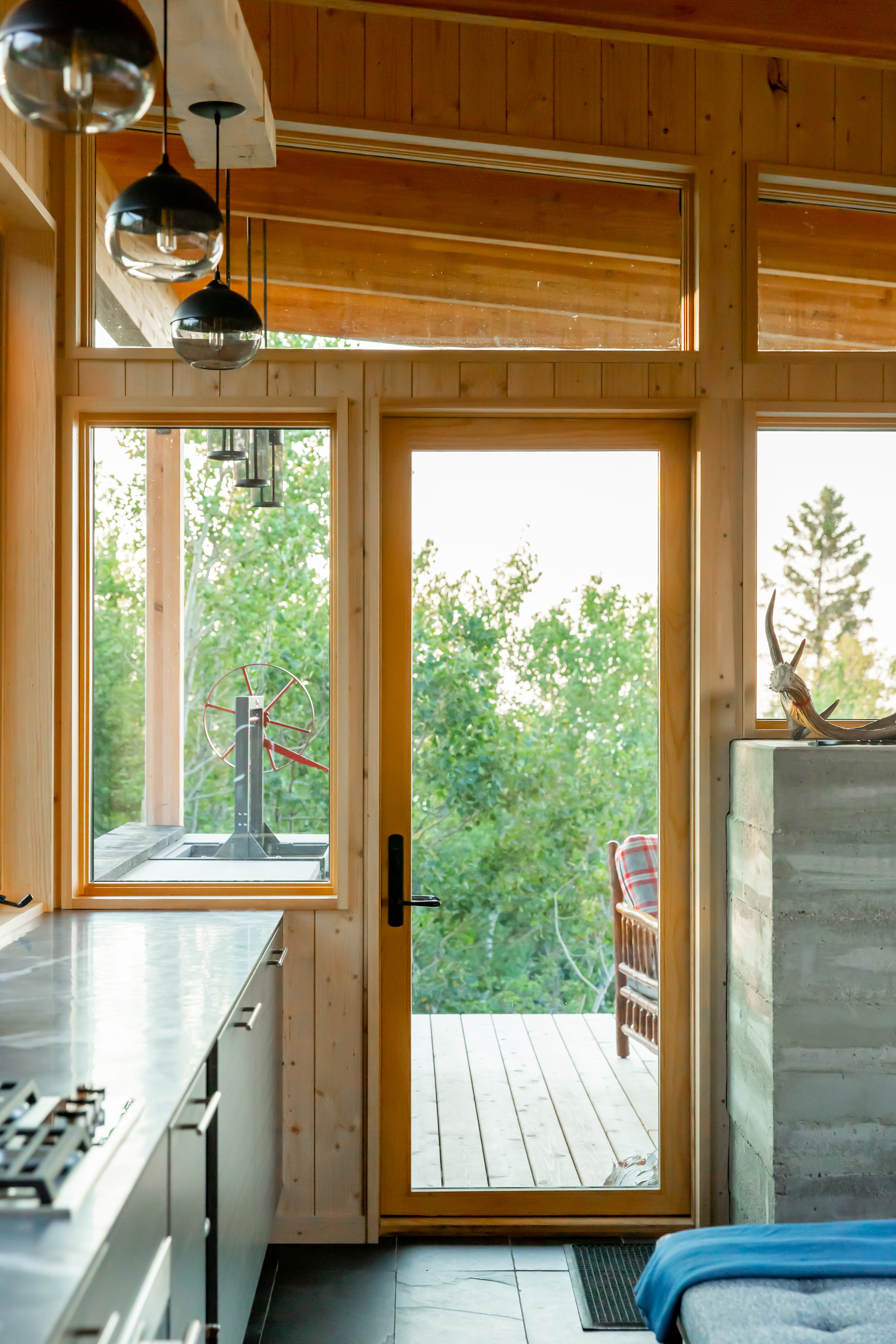There’s no reason outdoor kitchens can’t work in a cold climate, and Krissie Mason’s Lake Superior cabin proves it! A single panel E-Series Hinged Patio Door makes an easy connection between her indoor kitchen and outdoor kitchen while a roof and fireplace keep the outdoor kitchen protected and comfortable in all sorts of weather.