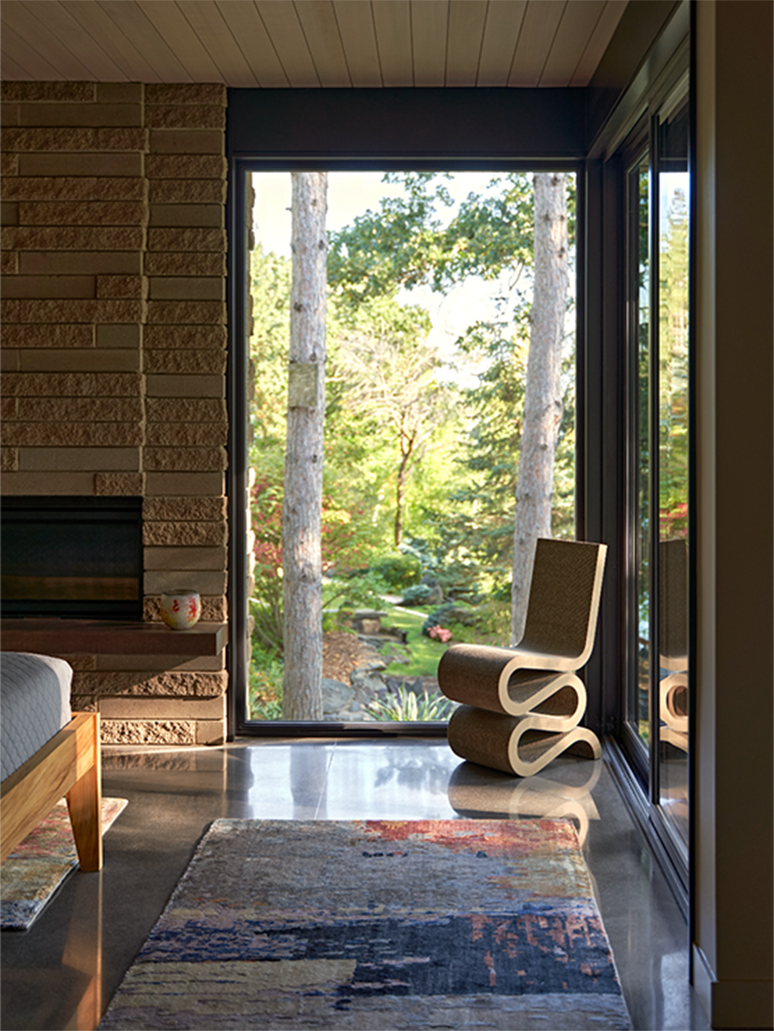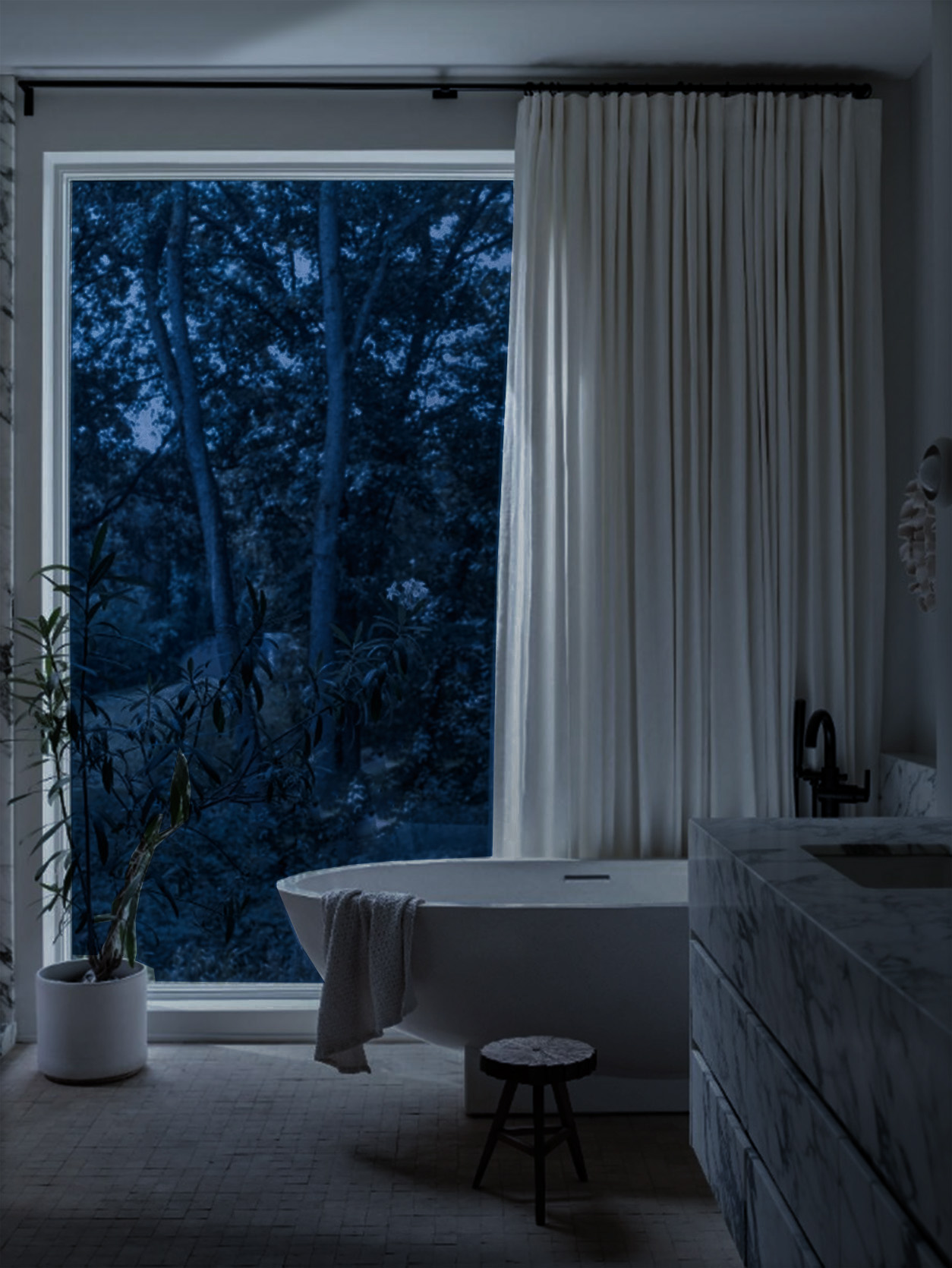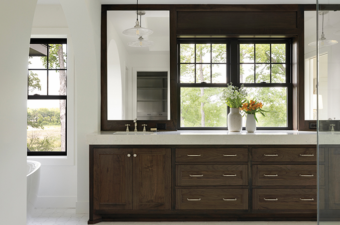 Let the view take center stage by keeping the palette simple; think white oak vanities, stone tile, and brushed or matte hardware. The goal is to create a space that feels open, grounded, and serene.