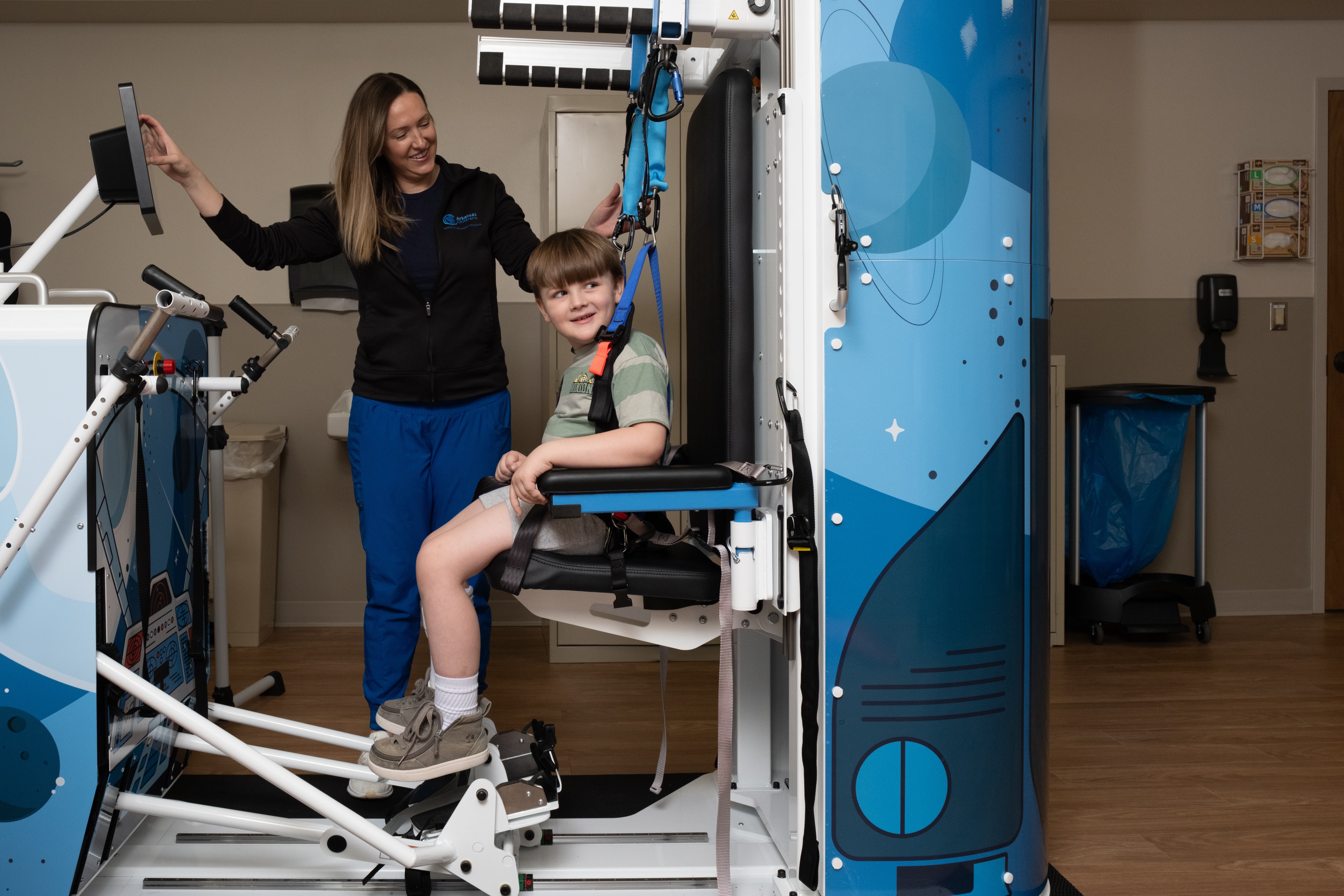The Rise and Walk neurorehabilitation machine safely allows children to practice the repetitive therapeutic movements vital for neuroplasticity and motor learning.