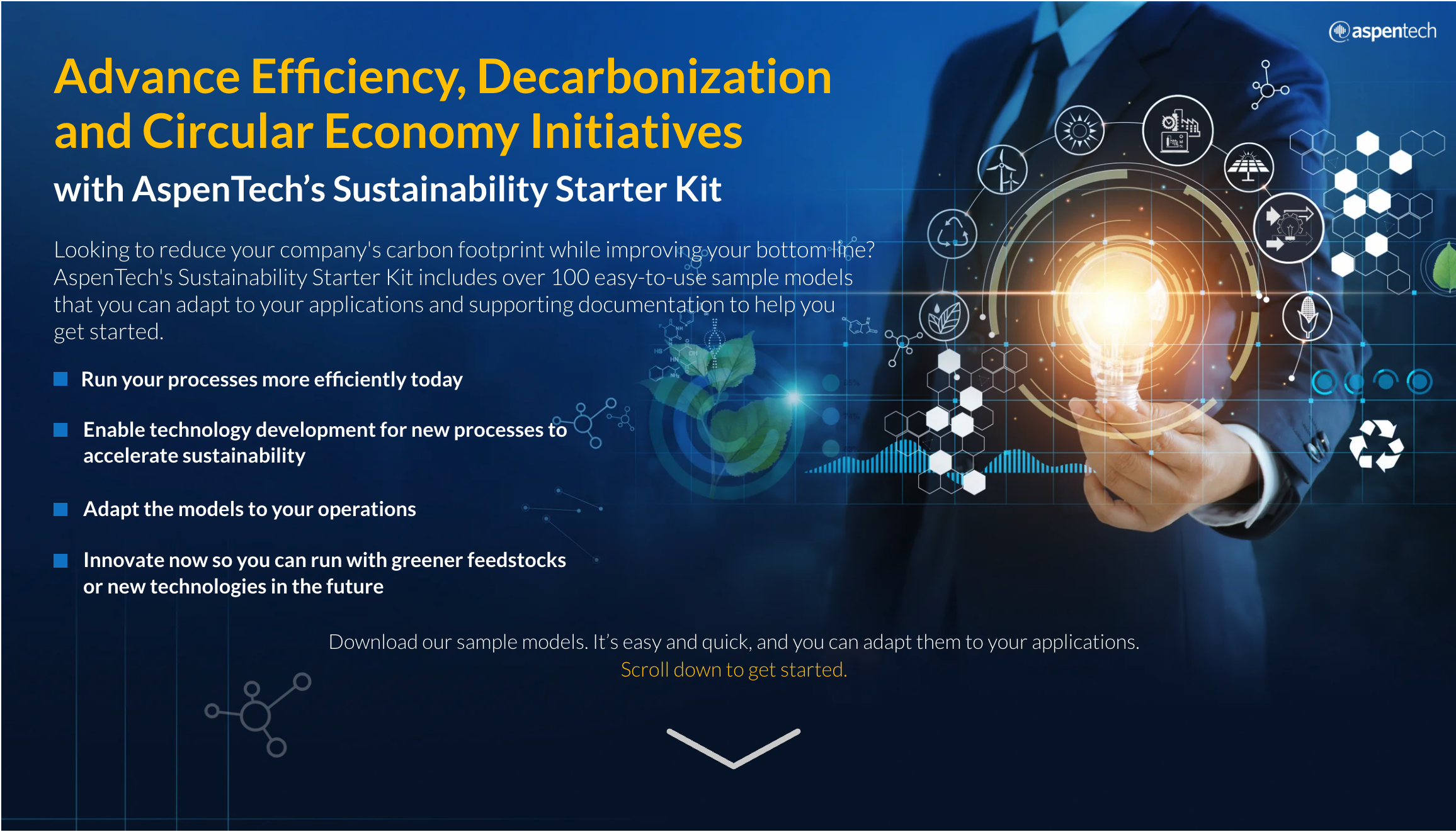 Advance your efficiency, decarbonization and circular economy initiatives with AspenTech’s Sustainability Starter Kit, which includes over 100 easy-to-use, easy-to-adapt sample models, and supporting documentation to help get you started. Check out our infographic today and choose from over 100 sample models, customized for your industry and area of interest.