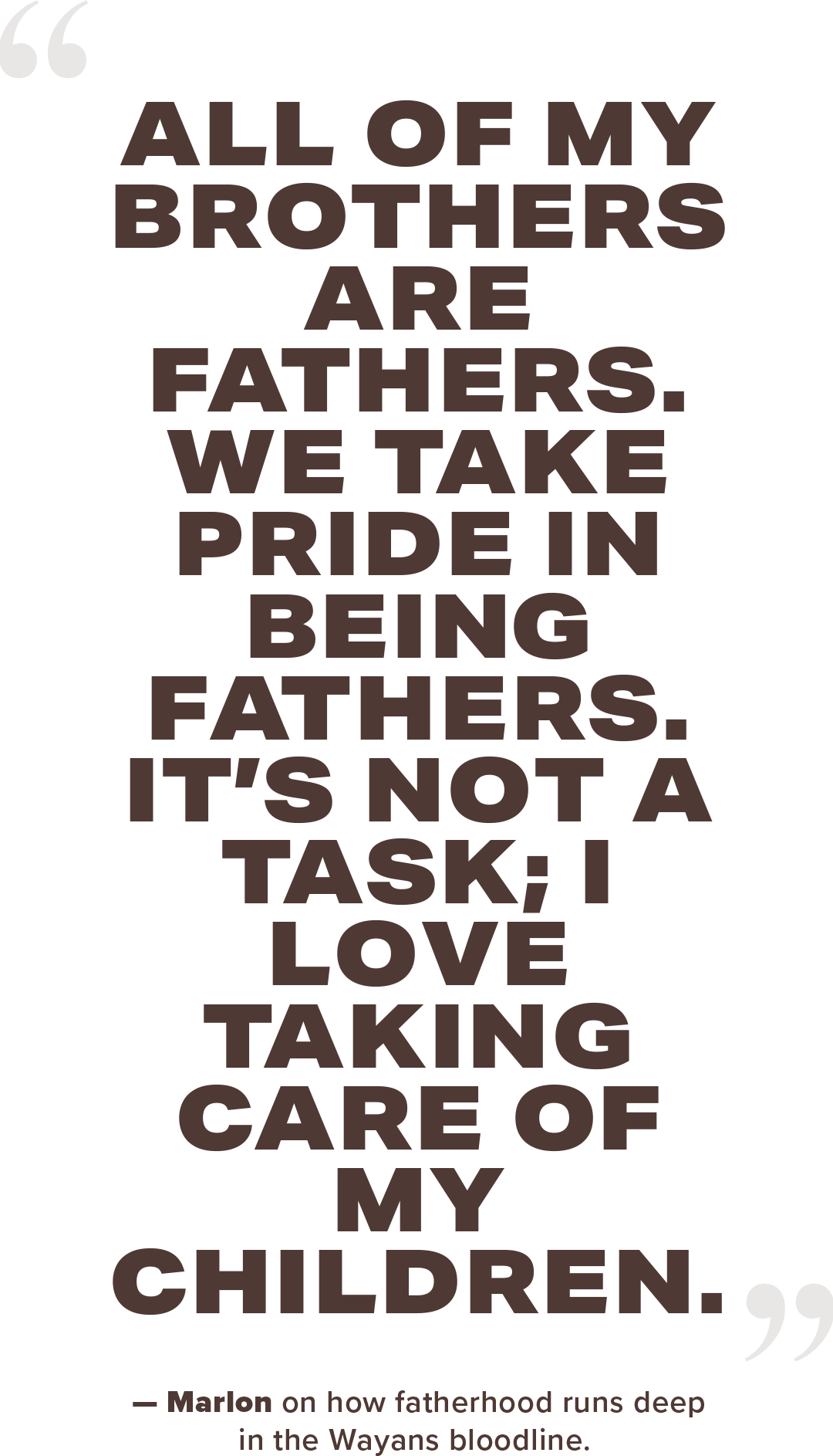 “All of my brothers are fathers. We take pride in being fathers. It’s not a task; I love taking care of my children,” Marlon explains. “I don't mind cooking for them, taking them on walks, or teaching them. I don't mind traveling with them. I love my kids.
