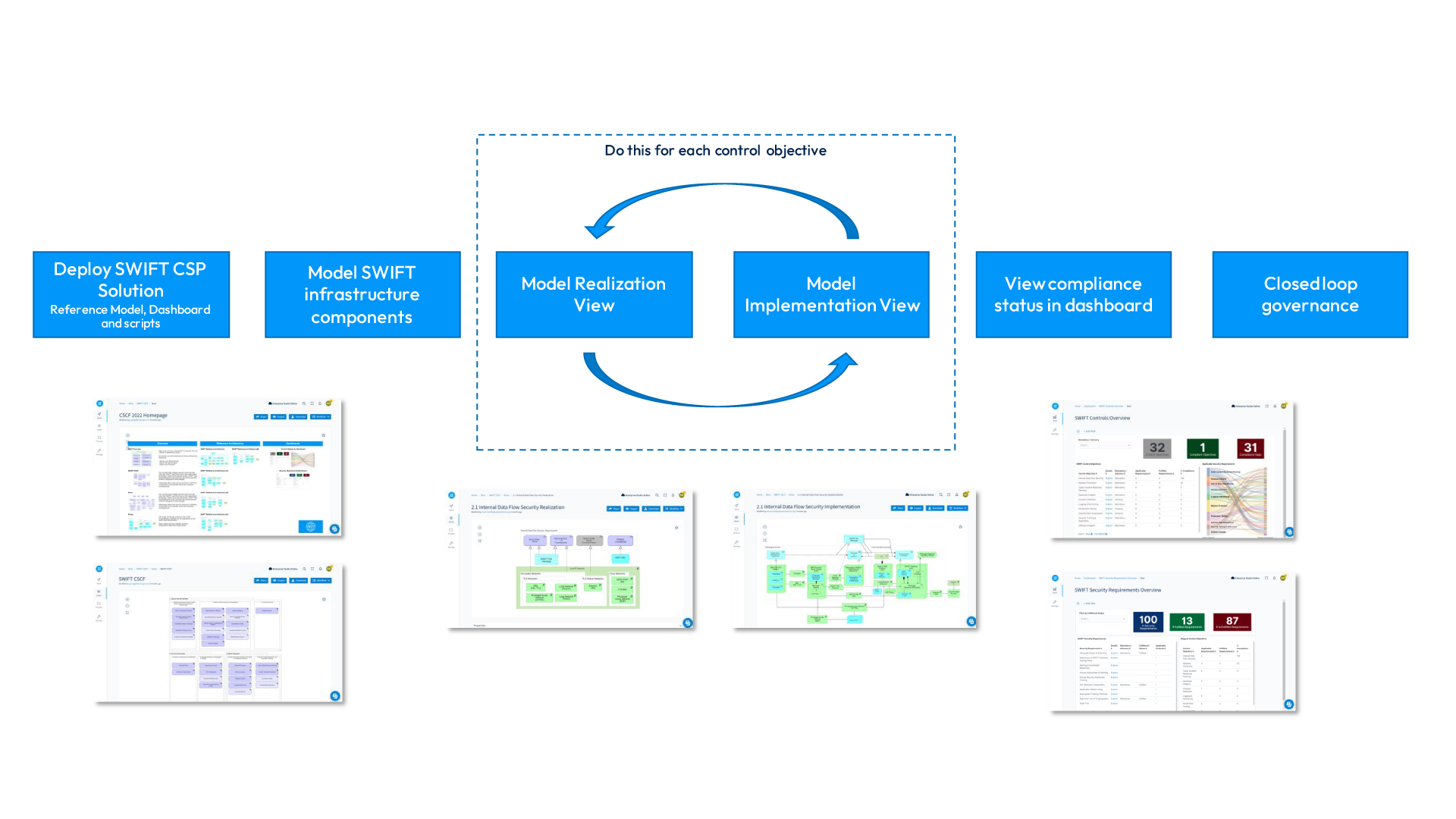 Objective-status dashboards indicate Swift compliance and audit readiness. Utilize dashboards to see compliance status in real-time. Dashboards are updated based on modeling data. As soon as any change in the architecture is modeled, the dashboards are updated, giving up-to-date compliance information.