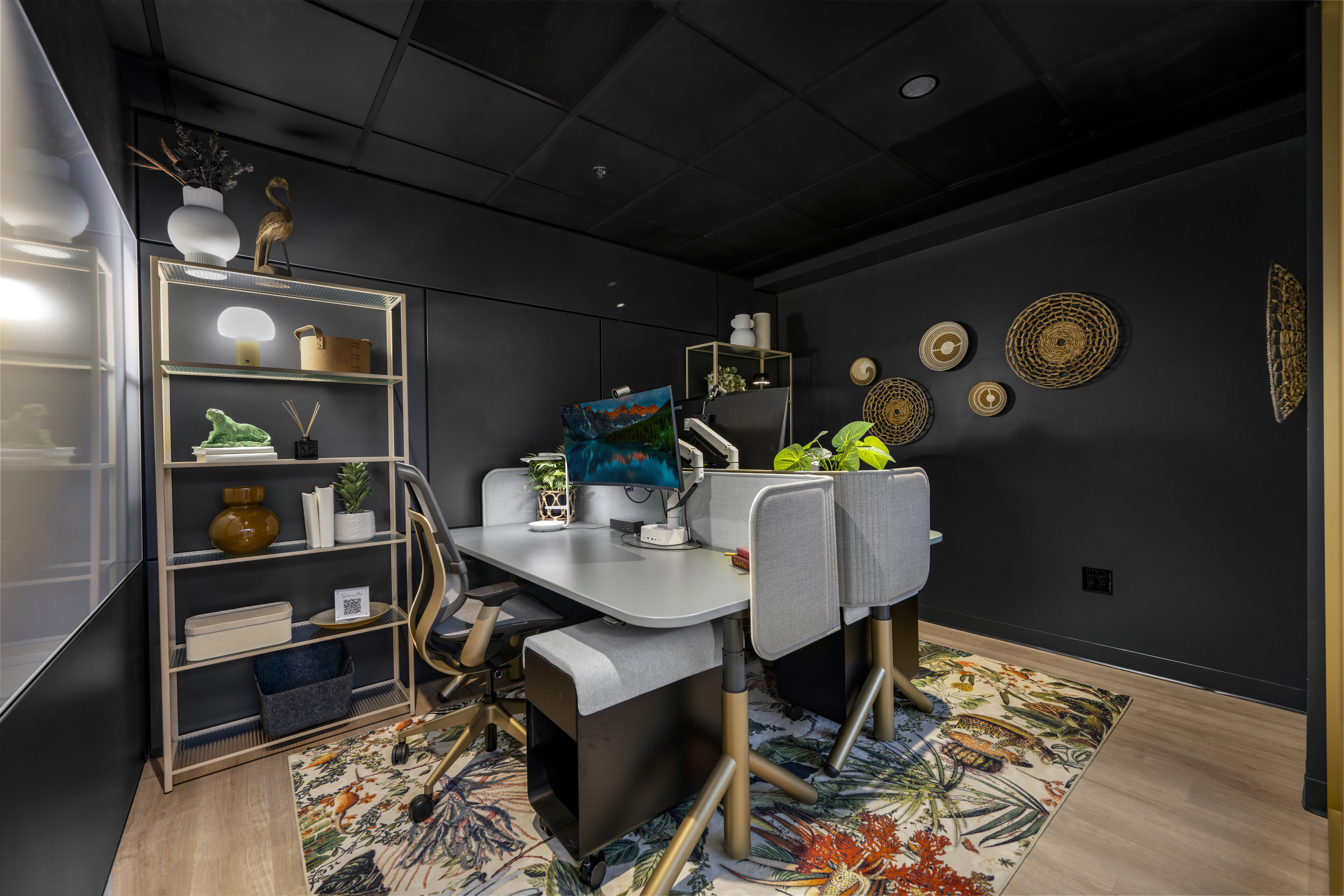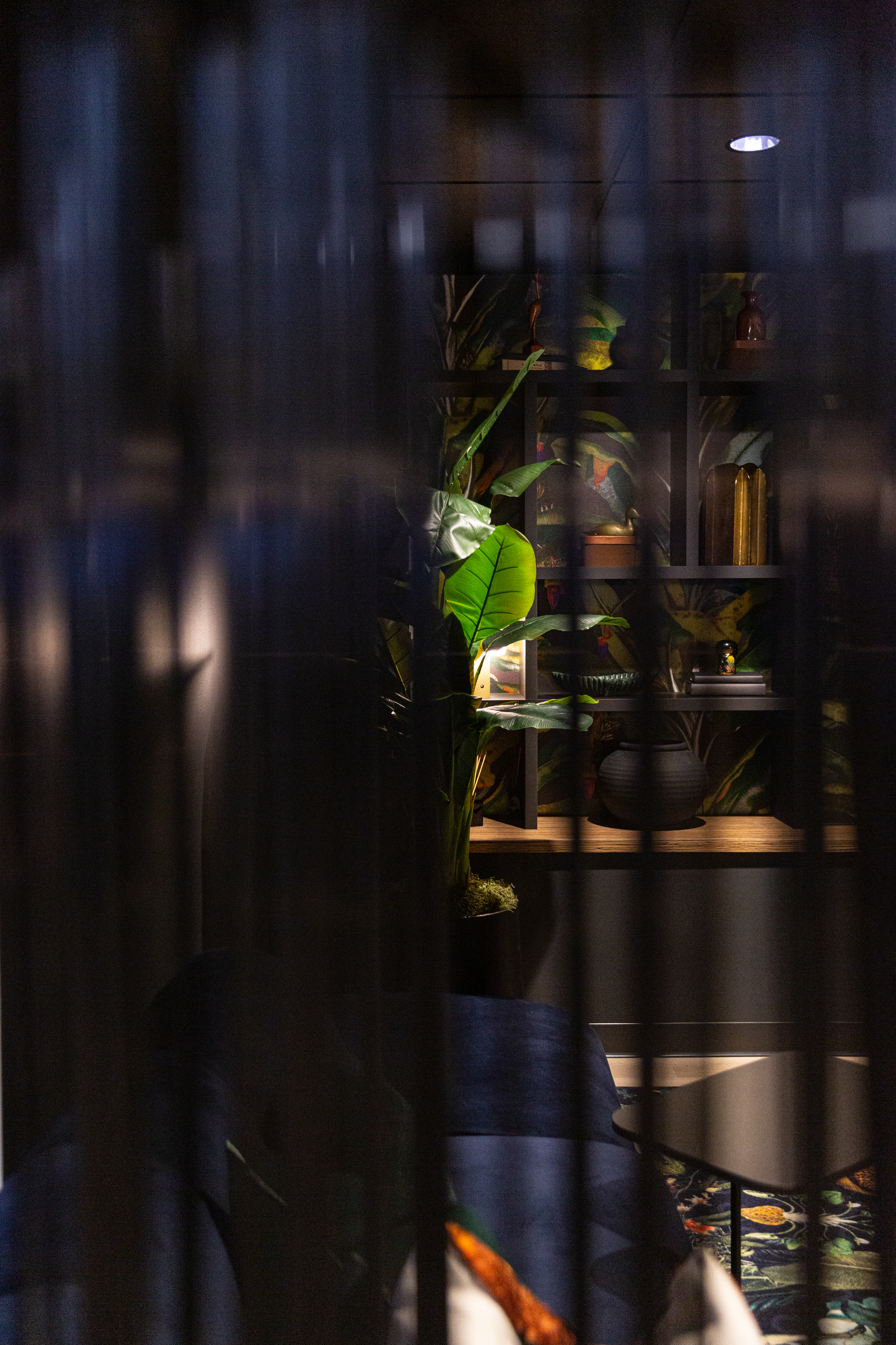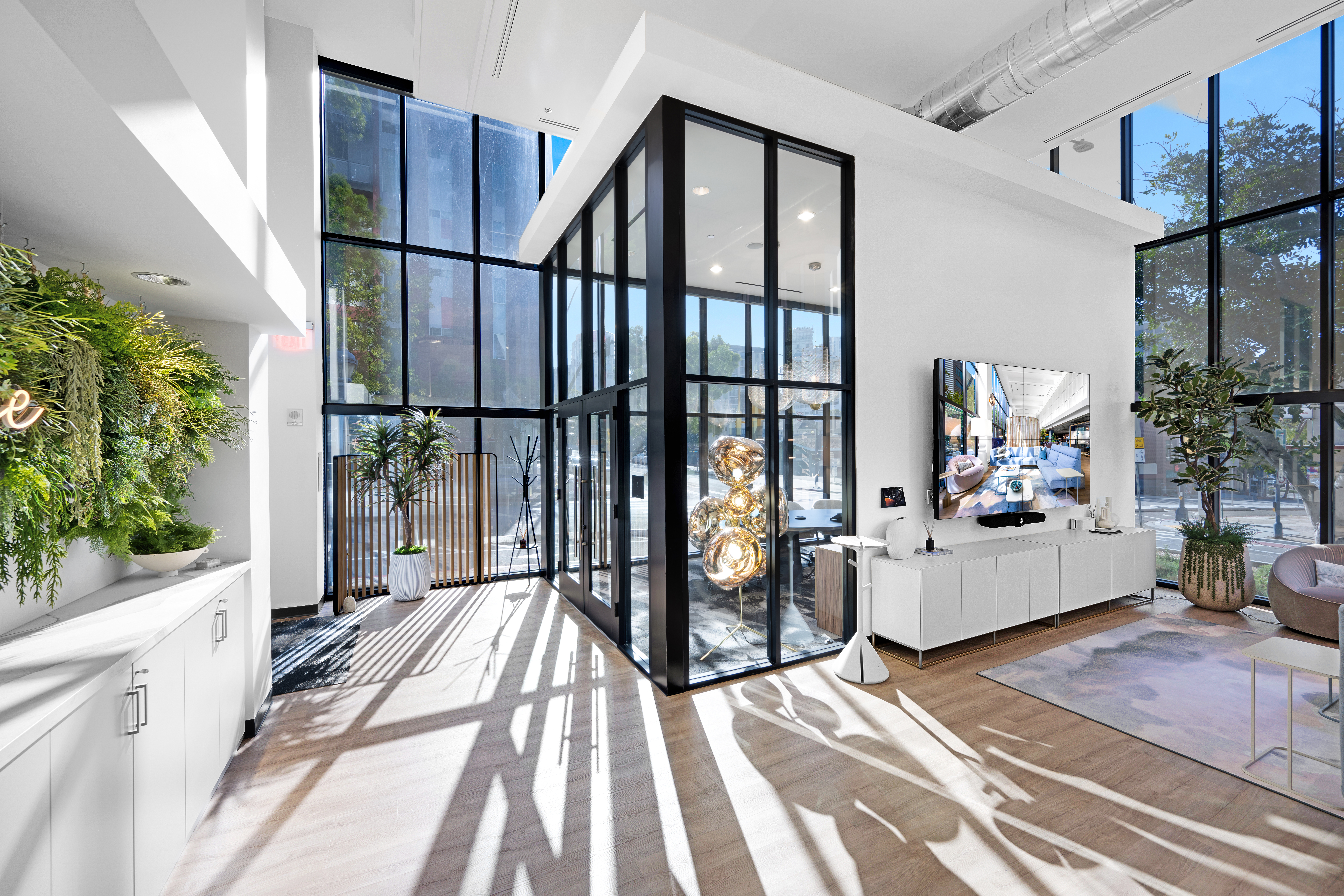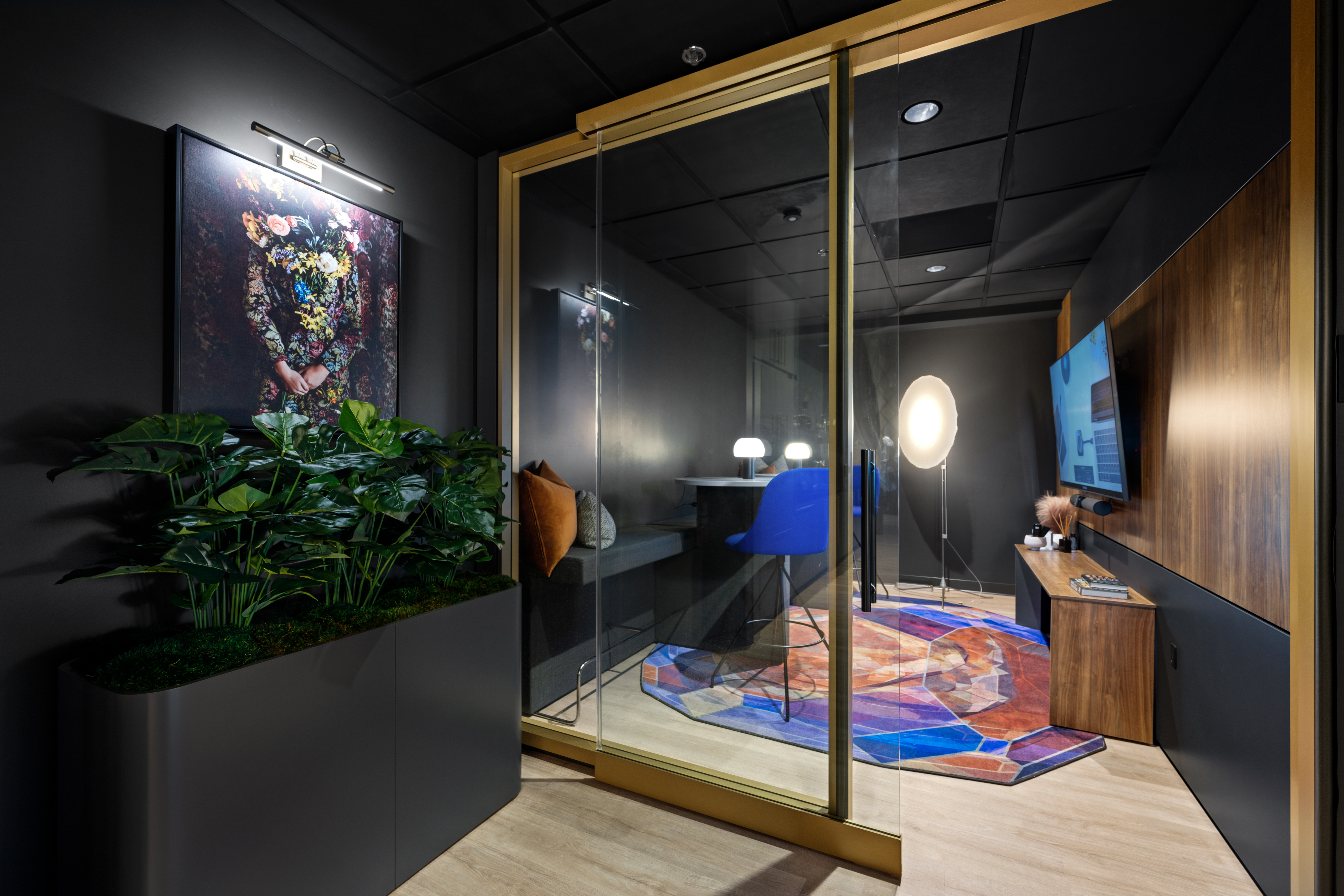 Our vision was to craft a space that redefines boundaries, integrating Fringe elements in unexpected and artful ways. Replica greenery, thoughtfully paired with hospitality-inspired design techniques, adds an inviting touch throughout. In the restroom corridor, a bold, color-drenched aesthetic extends even to the plants, creating a dramatic statement. Meanwhile, the entryway features cascading greenery that frames an eye-catching wall, elegantly accented by a custom neon sign, setting the tone for a memorable experience.