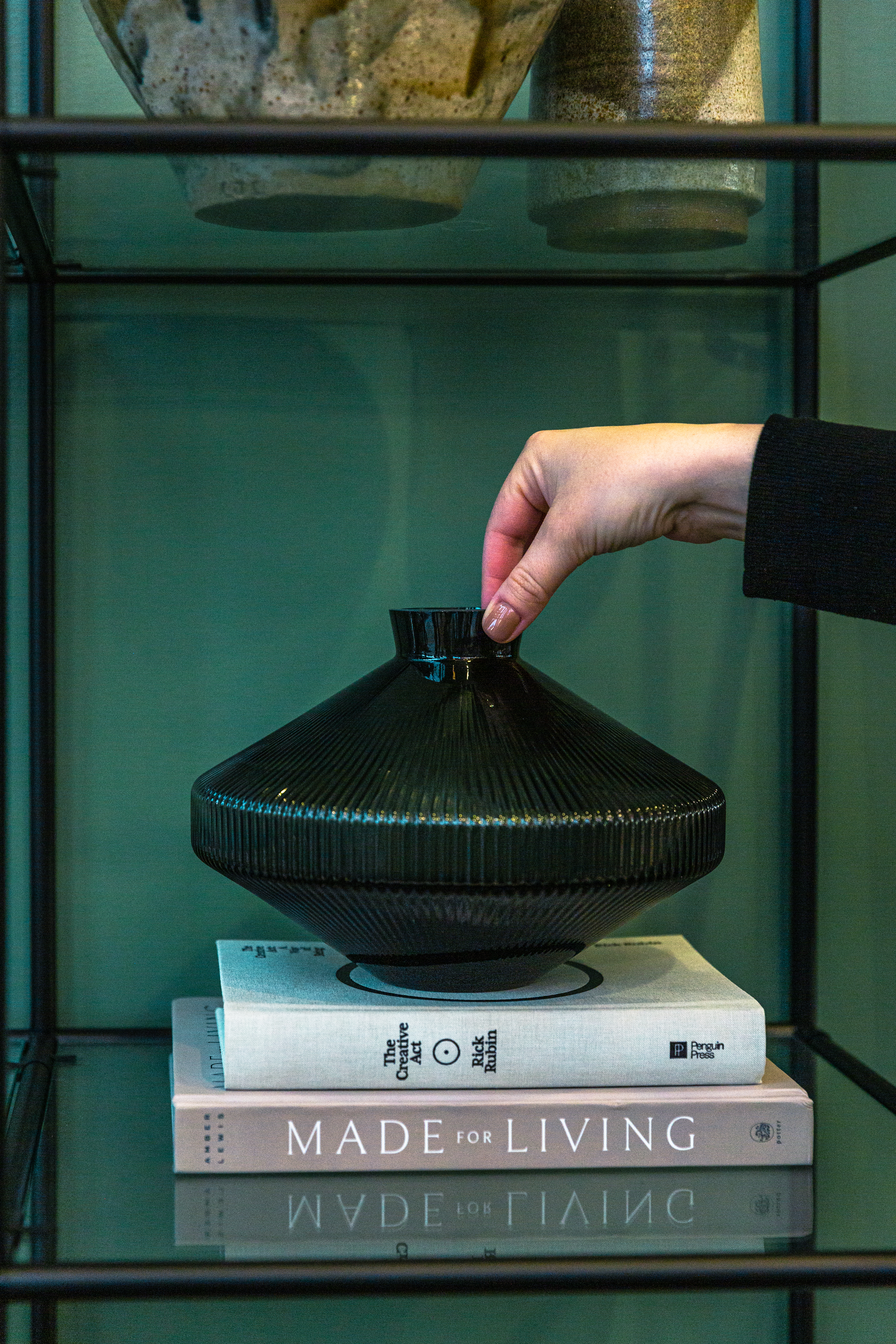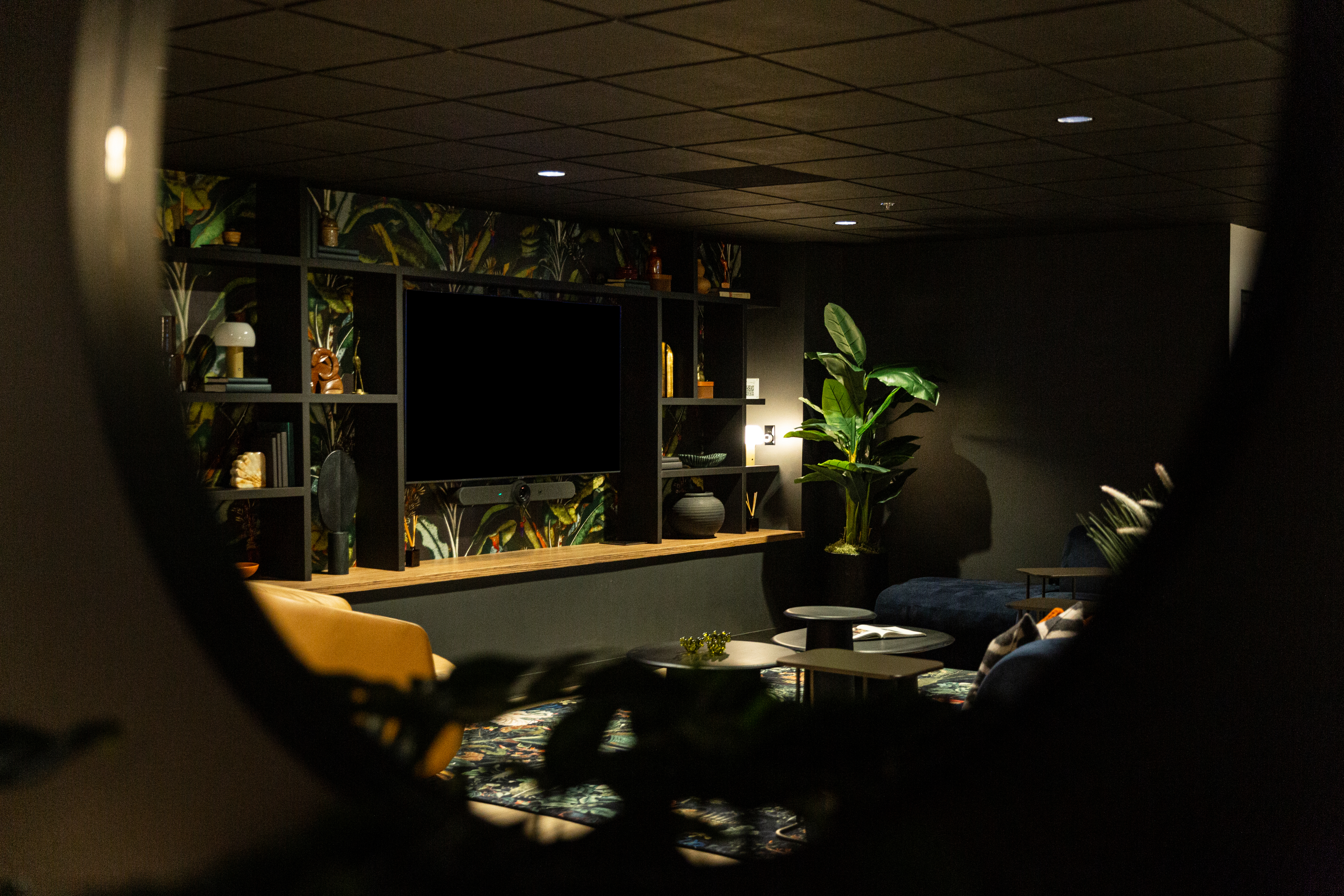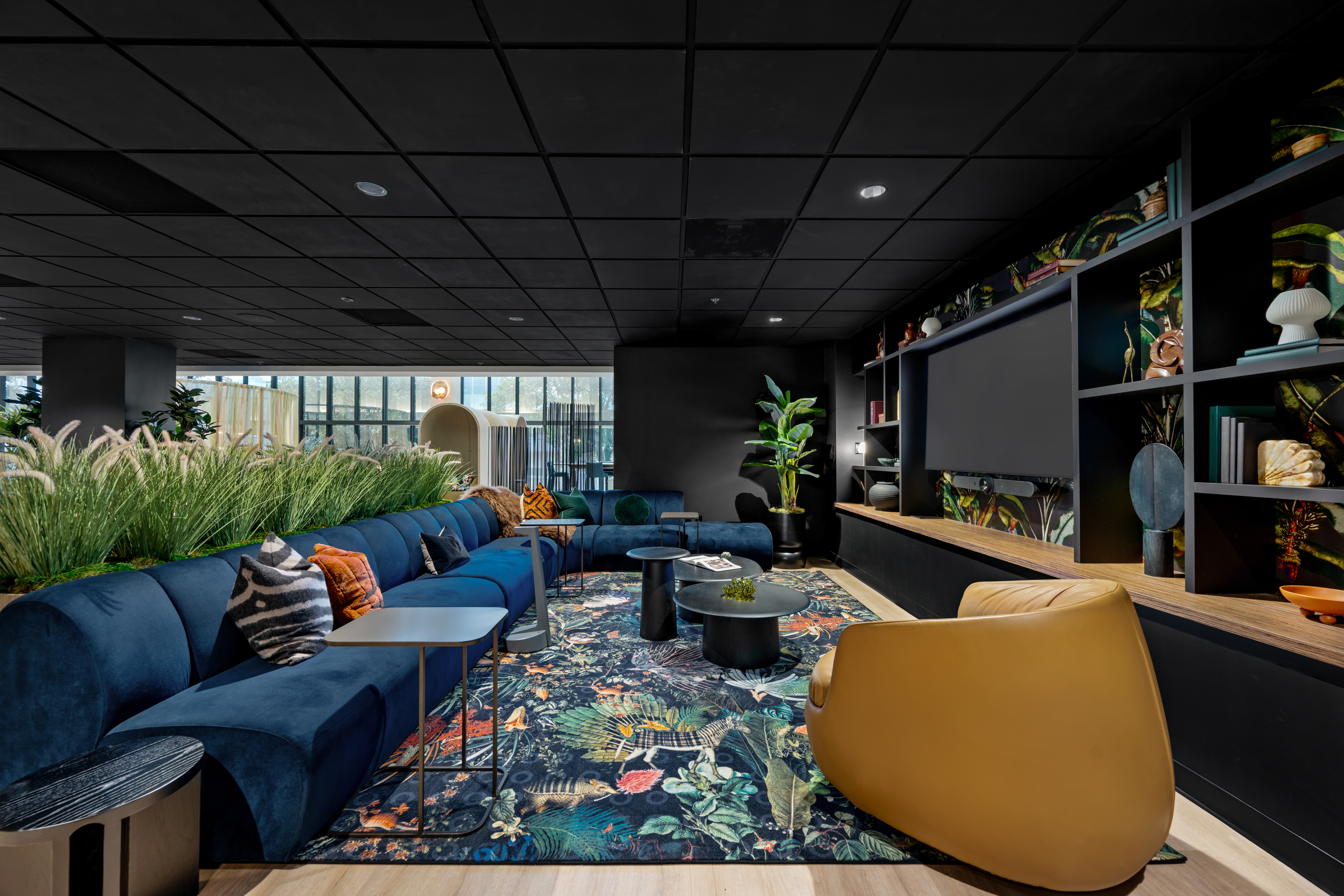 From the outset of designing REVERIE, Fringe was a fundamental focus. The space is often described as a trifecta, seamlessly combining three essential elements: furniture, technology, and the finishing touches. Every area was thoughtfully curated with distinctive objects and pieces designed to create a welcoming, home-like atmosphere. A standout feature is the custom millwork shelving wall in the living room, where a meticulous curation of found and vintage objects creates a striking pattern-on-pattern effect, adding depth, character, and richness to the space.