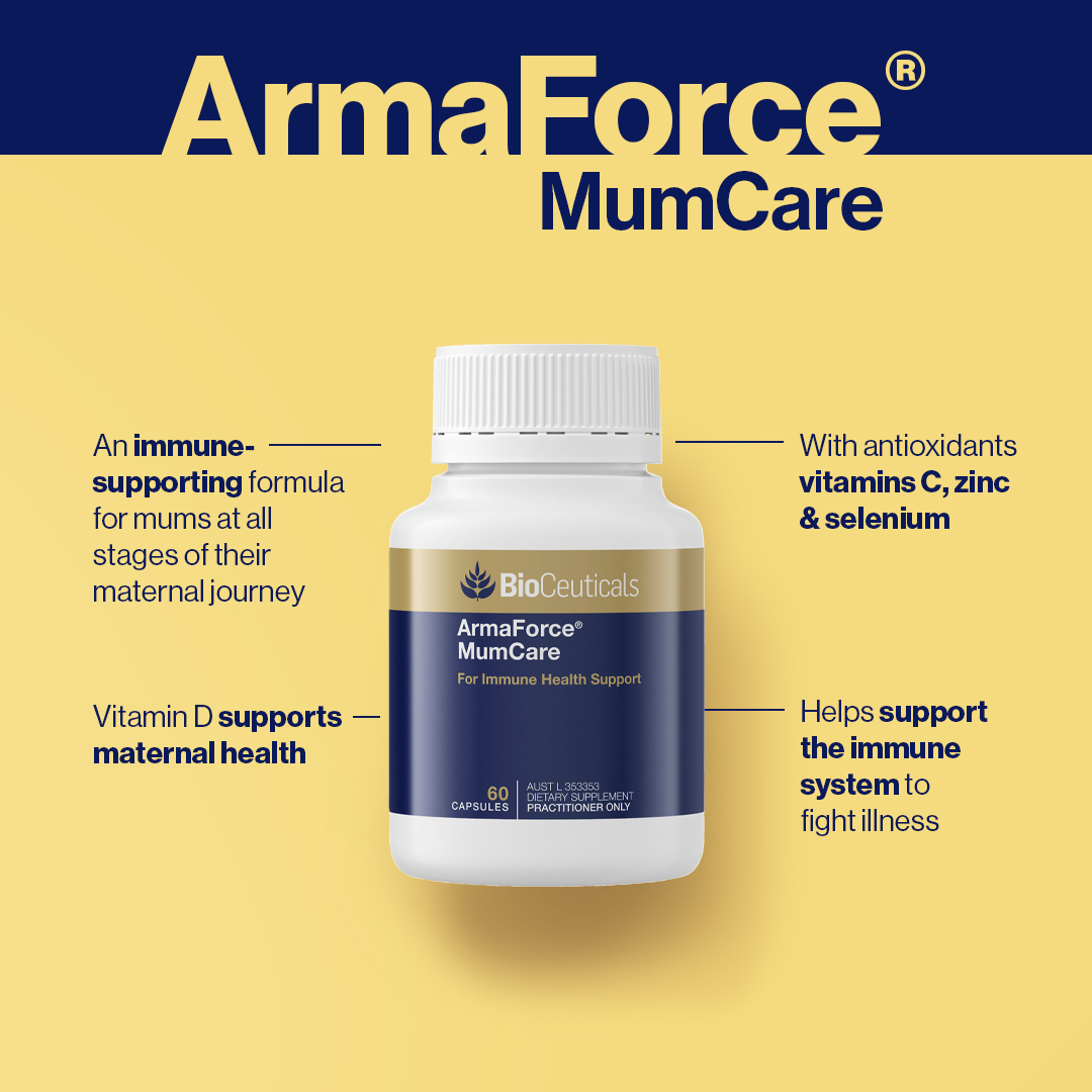 ArmaForce® MumCare features Vitamins C, D, zinc and selenium to support healthy immune system function and help support the immune system to fight illness.