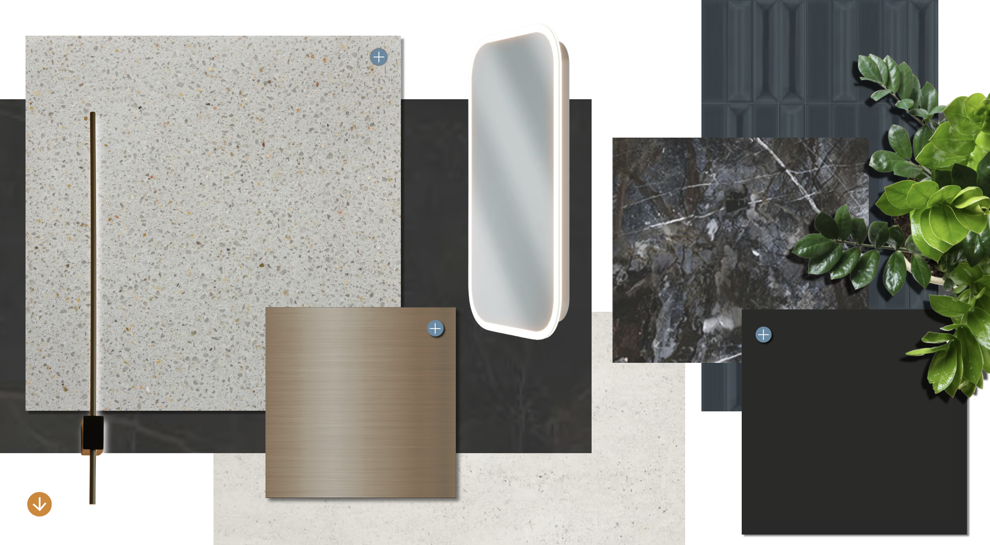 An array of materials collected with various paint colors, fabric swatches, flooring samples, wallpaper and much more to visually inspire designs with Bradley products.