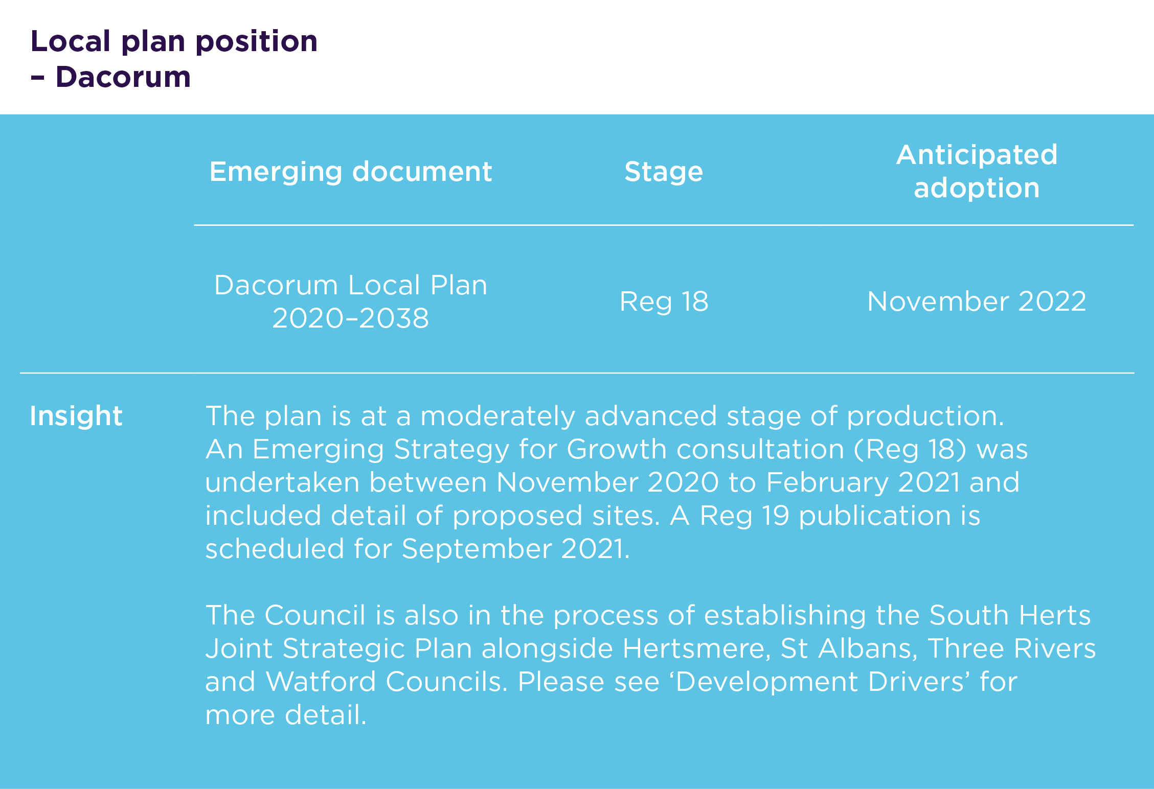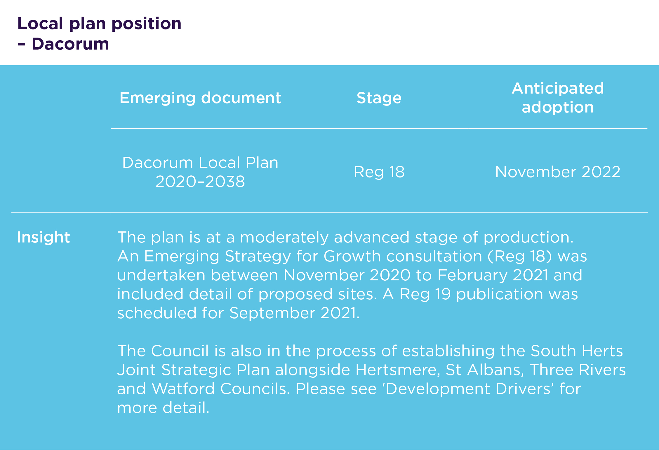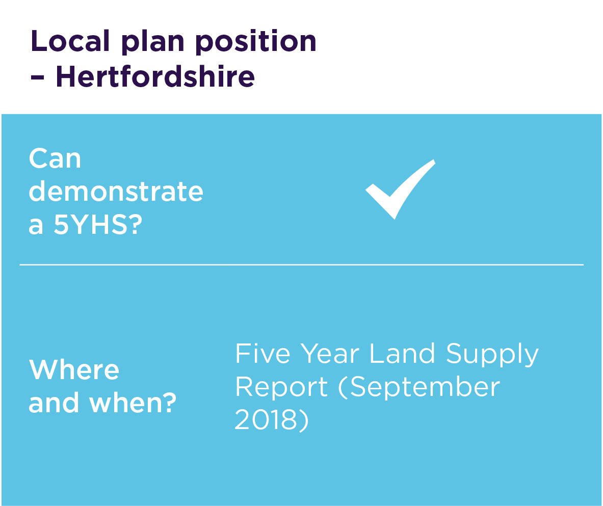 Please use the map below to reveal the Local Plan position,5-year housing land supply and recent Housing Delivery Test (HDT) results for the Hertfordshire authorities.