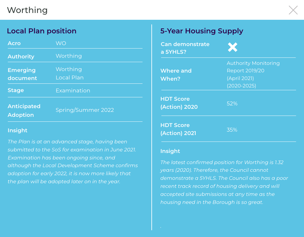 The latest confirmed position for Worthing is 1.4 years (2022) and therefore the Council cannot demonstrate a 5YHLS. The Council also has a poor recent track record of housing delivery and will accept site submissions at any time as the housing need in the Borough is so great. Speculative opportunities should therefore also be explored.