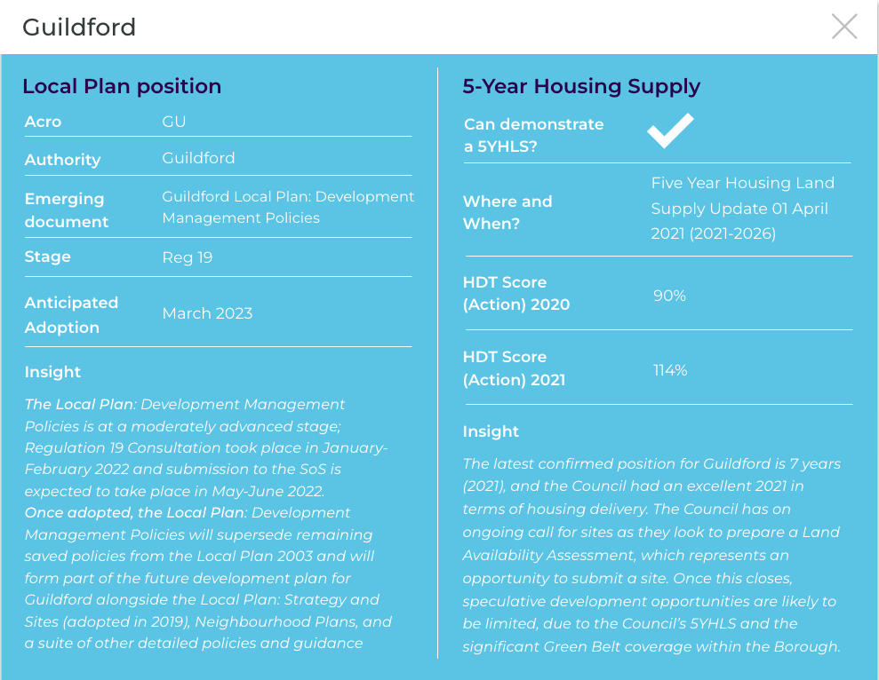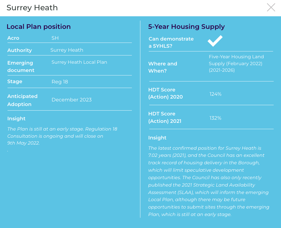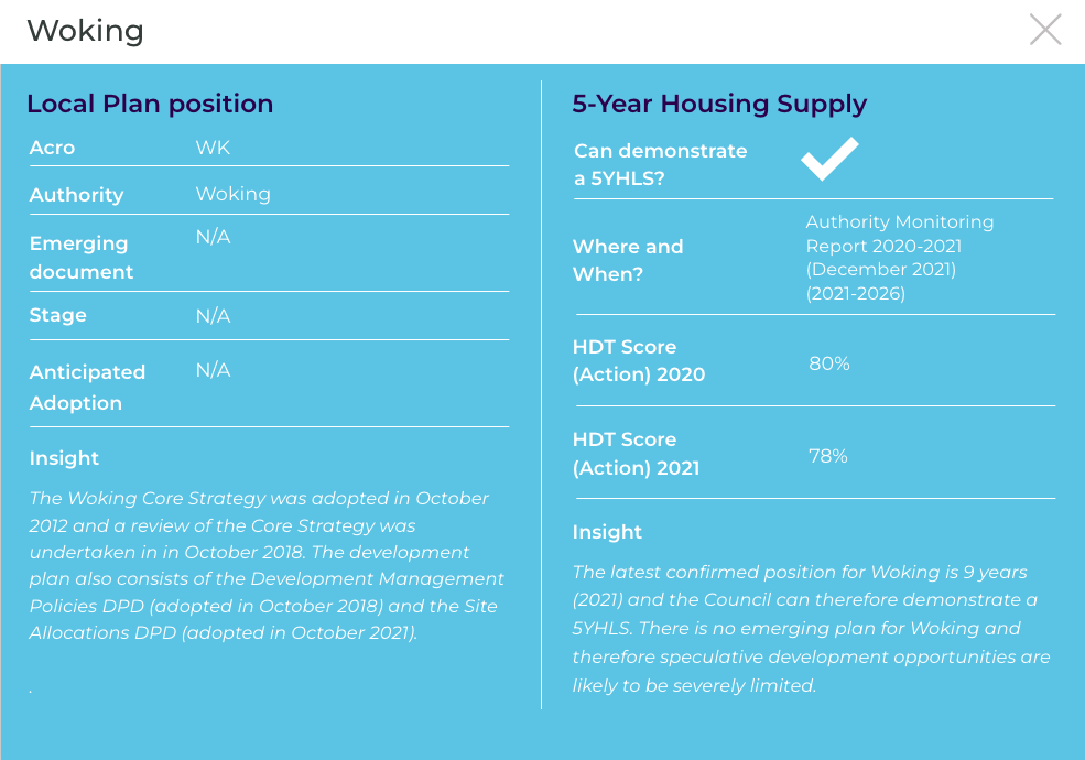 The latest confirmed position for Woking is 9 years (2022) and therefore the Council can demonstrate a 5YHLS with a very strong position. Speculative development opportunities are therefore likely to be severely limited.