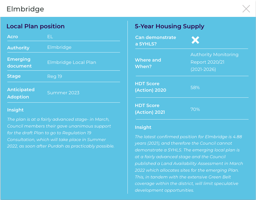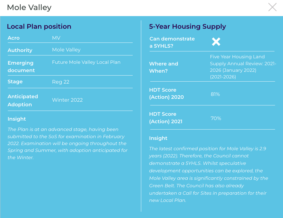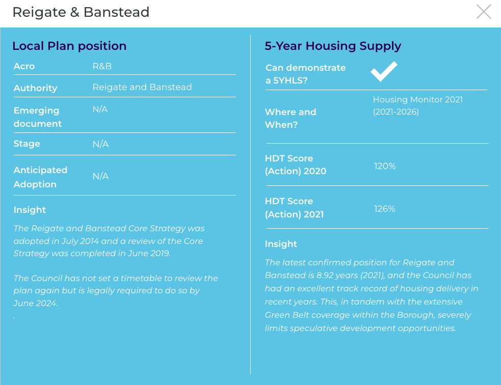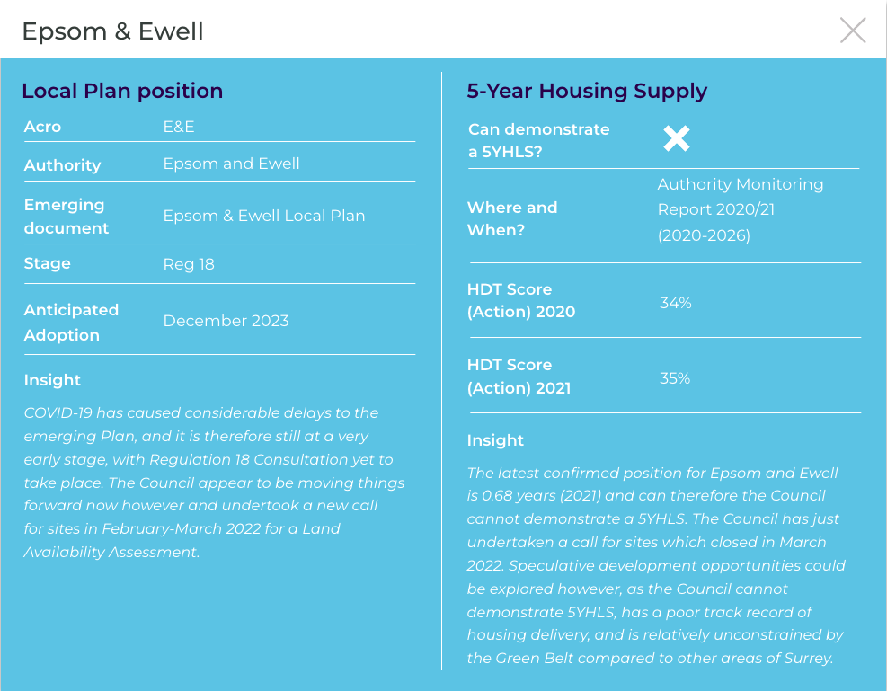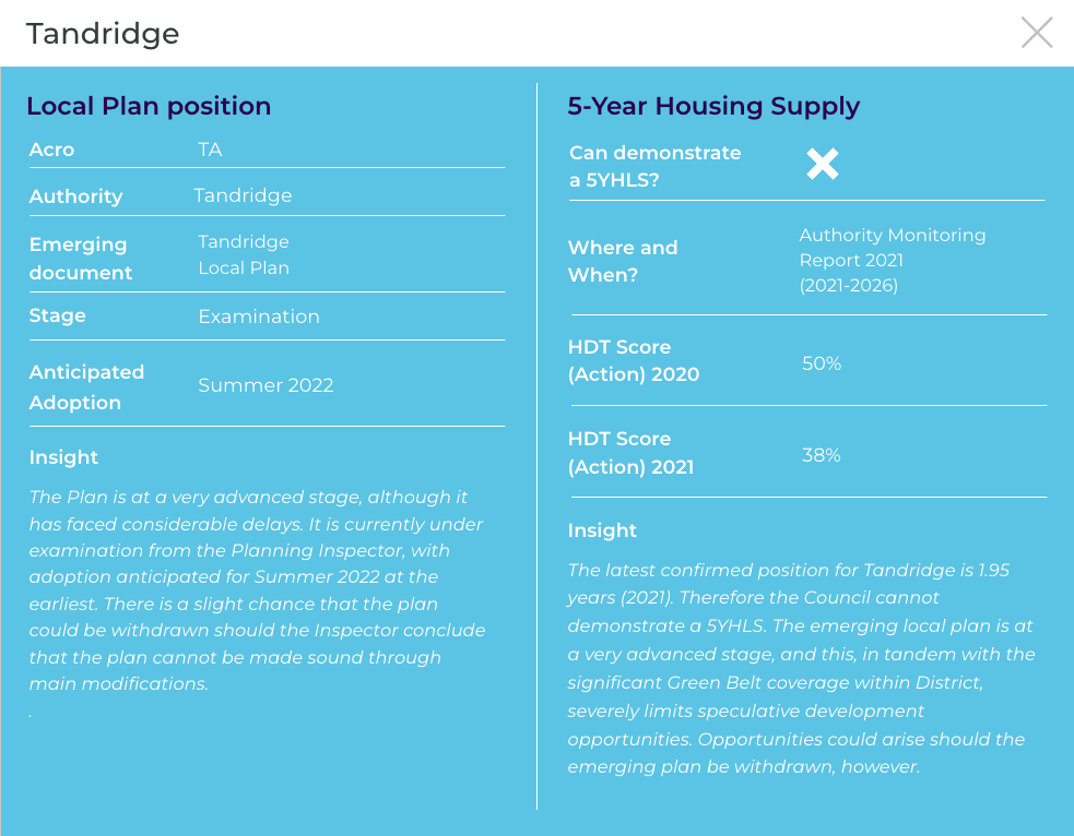 The latest confirmed position for Tandridge is 3.02 years (2022) and therefore the Council cannot demonstrate a 5YHLS. There is significant Green Belt coverage within District, although the Council’s housing need is so acute that speculative opportunities should be explored regardless. The emerging local plan is at a very advanced stage, although could be withdrawn, which may also present opportunities.