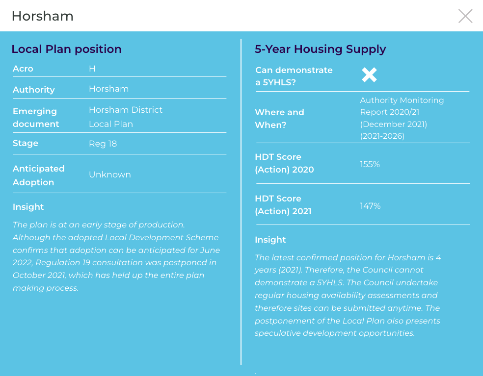 The latest confirmed position for Horsham is 3 years (2022) and therefore the Council cannot demonstrate a 5YHLS. The Council has an excellent record of recent housing delivery, which is likely to limit speculative development opportunities. However, the Council undertake regular housing availability assessments and therefore sites can be submitted anytime. The postponement of the Local Plan may also present speculative development opportunities.
