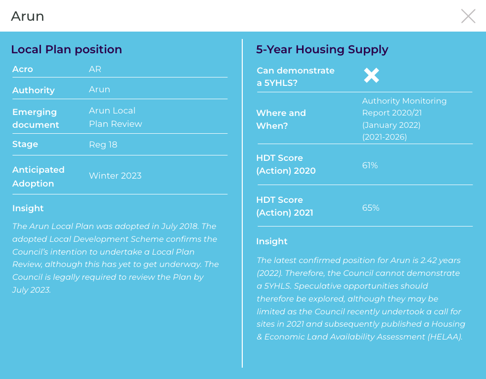 The latest confirmed position for Arun is 2.36 years (2023) and therefore the Council cannot demonstrate a 5YHLS. The Council also has a poor recent track record of housing delivery and speculative opportunities should therefore be explored. The Council will also accept site submissions at any time.