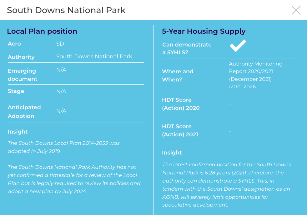 The latest confirmed position for the South Downs National Park is 5.61 years (2022) and therefore the authority can demonstrate a 5YHLS. This, in tandem with the South Downs’ designation as an AONB, will severely limit opportunities for speculative development.
