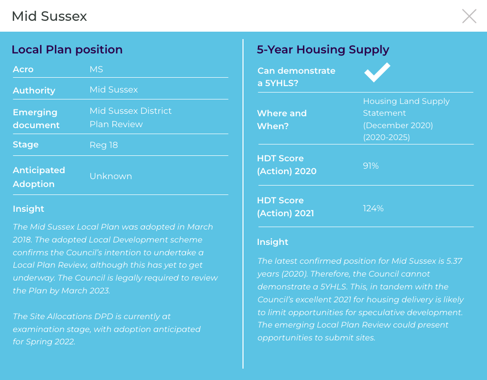 The latest confirmed position for Mid Sussex is 5.59 years (2022) and therefore the Council can demonstrate a 5YHLS. This, in tandem with the Council’s excellent 2021 for housing delivery is likely to limit opportunities for speculative development. However the emerging Local Plan Review is likely to present opportunities to submit sites.