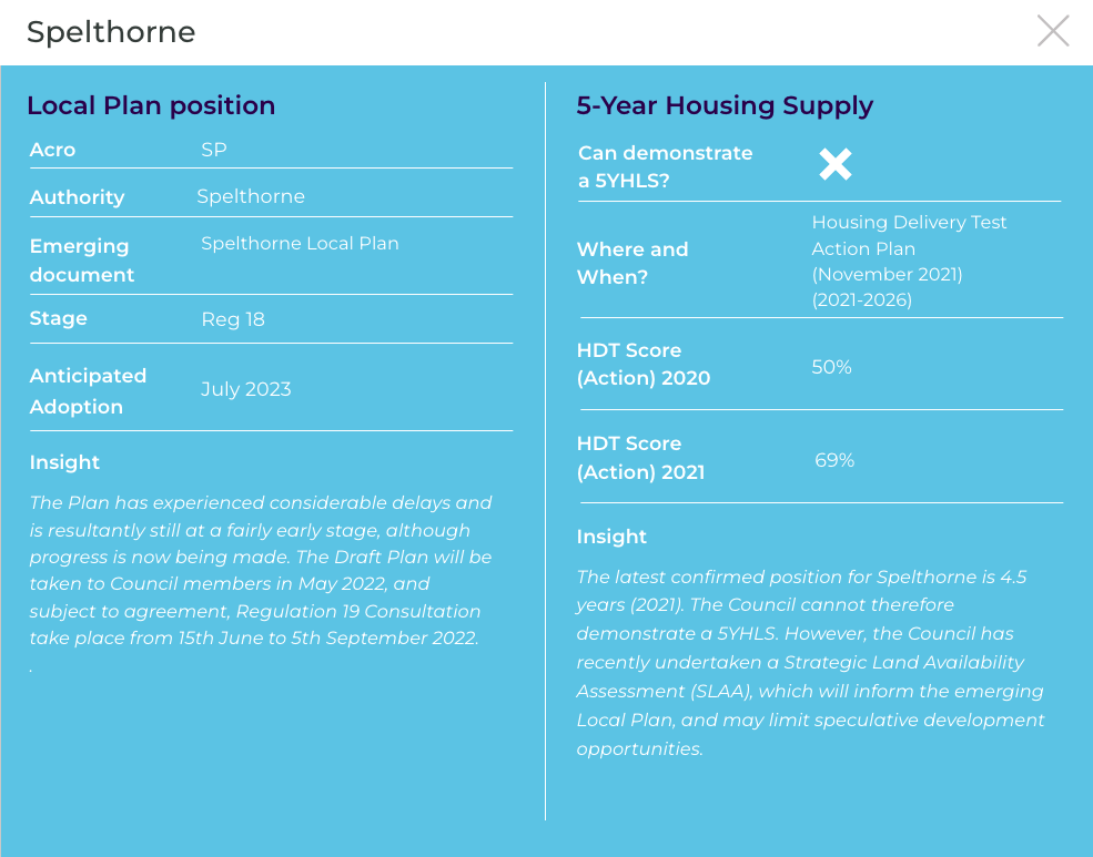 The latest confirmed position for Spelthorne is 5.6 years (2022) and therefore the Council cannot demonstrate a 5YHLS. The Council’s position is likely to improve further upon adoption of the new Local Plan and this, in tandem with the extensive Green Belt coverage within the Borough, will limit speculative opportunities.