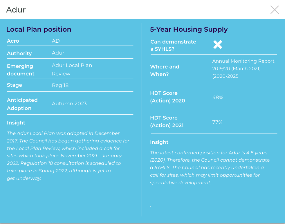 The latest confirmed position for Adur is 4.8 years (2020). Therefore, the Council cannot demonstrate a 5YHLS. The Council has recently undertaken a call for sites, which may limit opportunities for speculative development.