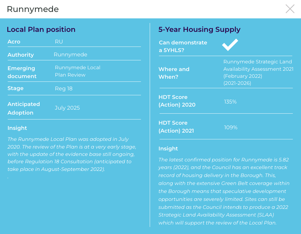 Runnymede is one example of an LPA particularly affected by the changes to the NPPF as the Council has an emerging Local Plan and can demonstrate a 5YHLS. The Council had begun undertaking a review of its Local Plan (adopted in July 2020), but halted work in December 2022 on the emerging Local Plan Review, giving themselves an opportunity to consider whether to proceed with the old-style plans, or to restart the process with the new-style plans, once the NPPF changes come into effect. The decision for the Council is whether to progress with the emerging Plan, avoiding abortive work, or whether to start again from scratch in a more favourable (in terms of their level of control) policy environment, where the Council would no longer have to demonstrate a 5YHLS and would generally have more control over planning policy and the distribution and quantum of new housing in the Borough.