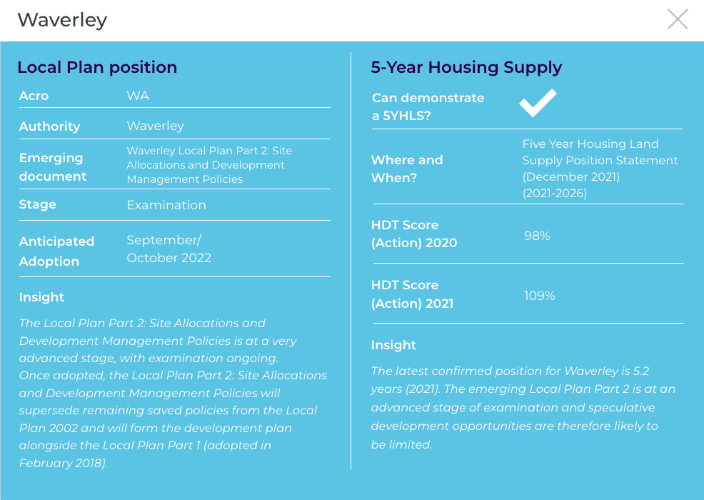 The latest confirmed position for Waverley is 4.9 years (2022) and therefore the Council cannot demonstrate a 5YHLS. The Council has an excellent track record of housing delivery in recent years and this, in tandem with the extensive Green Belt coverage within the Borough, severely limits speculative development opportunities.