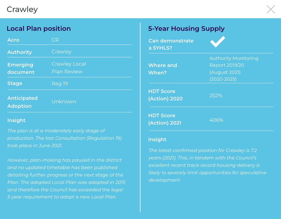 The latest confirmed position for Crawley is 7.2 years (2022) and therefore the Council can demonstrate a 5YHLS. This, in tandem with the Council’s excellent recent track record of housing delivery is likely to severely limit opportunities for speculative development. However, the Council accept brownfield site submissions at any time for it’s Brownfield Land Register, which is reviewed at least annually.