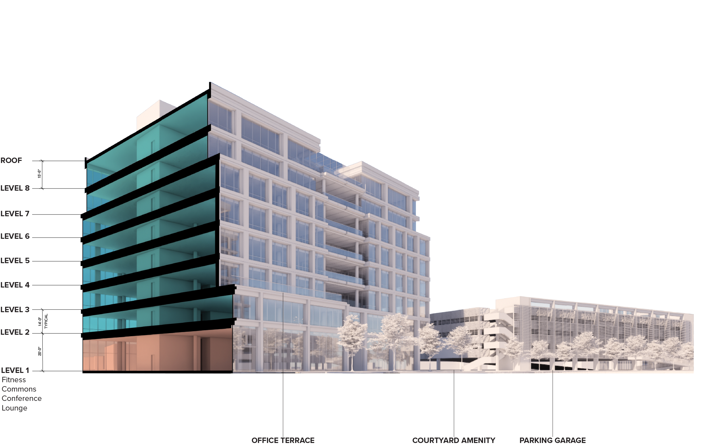 dramatic two-story lobby multi-functional conference facility upscale tenante lounge shaded outdoor patio private, open-air decks