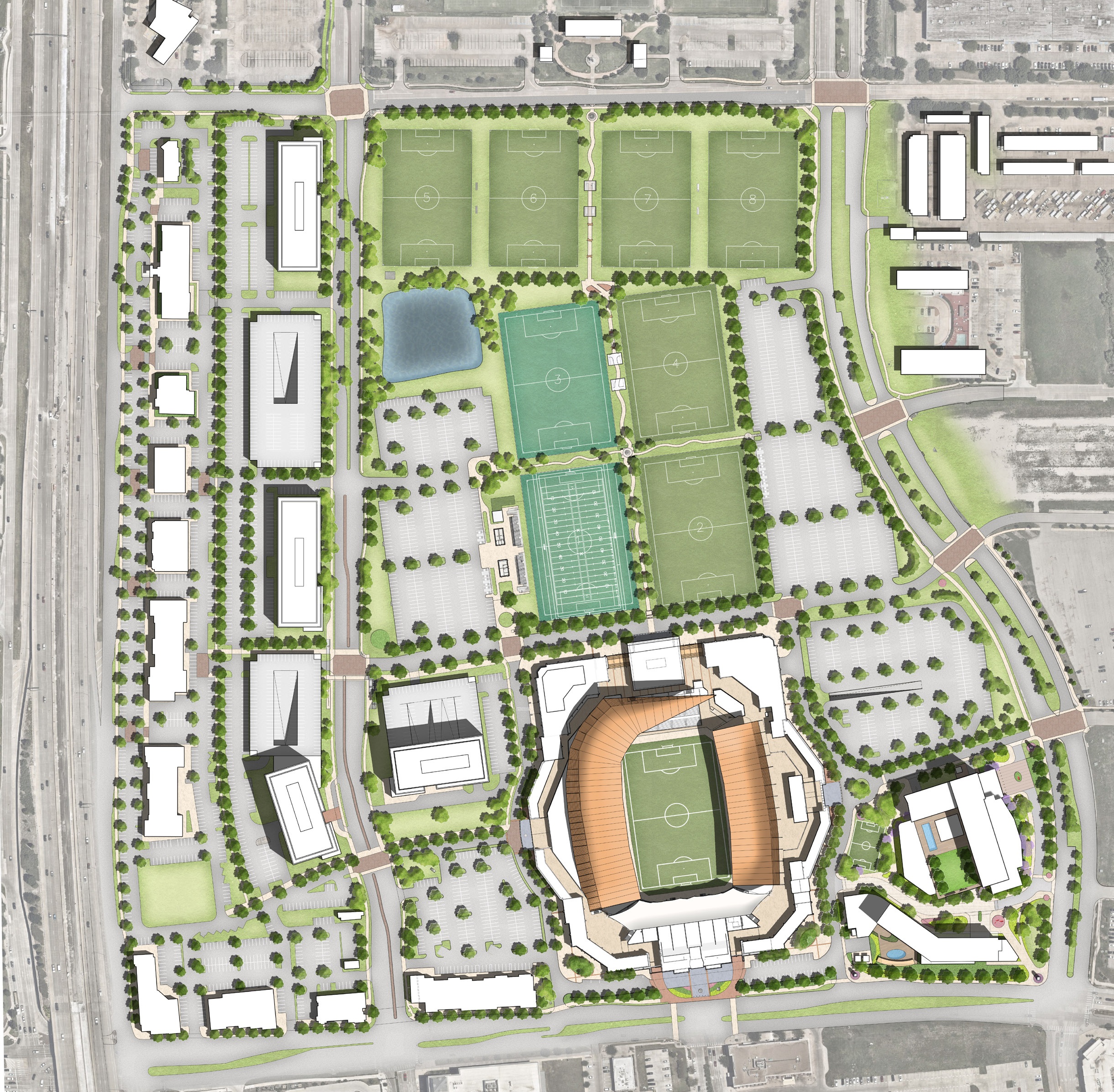 The $182 million renovation of Toyota Stadium will be surrounded by new developements of offices, upscale hotel, multifamily residential units, and extensive retail and restaurant space.