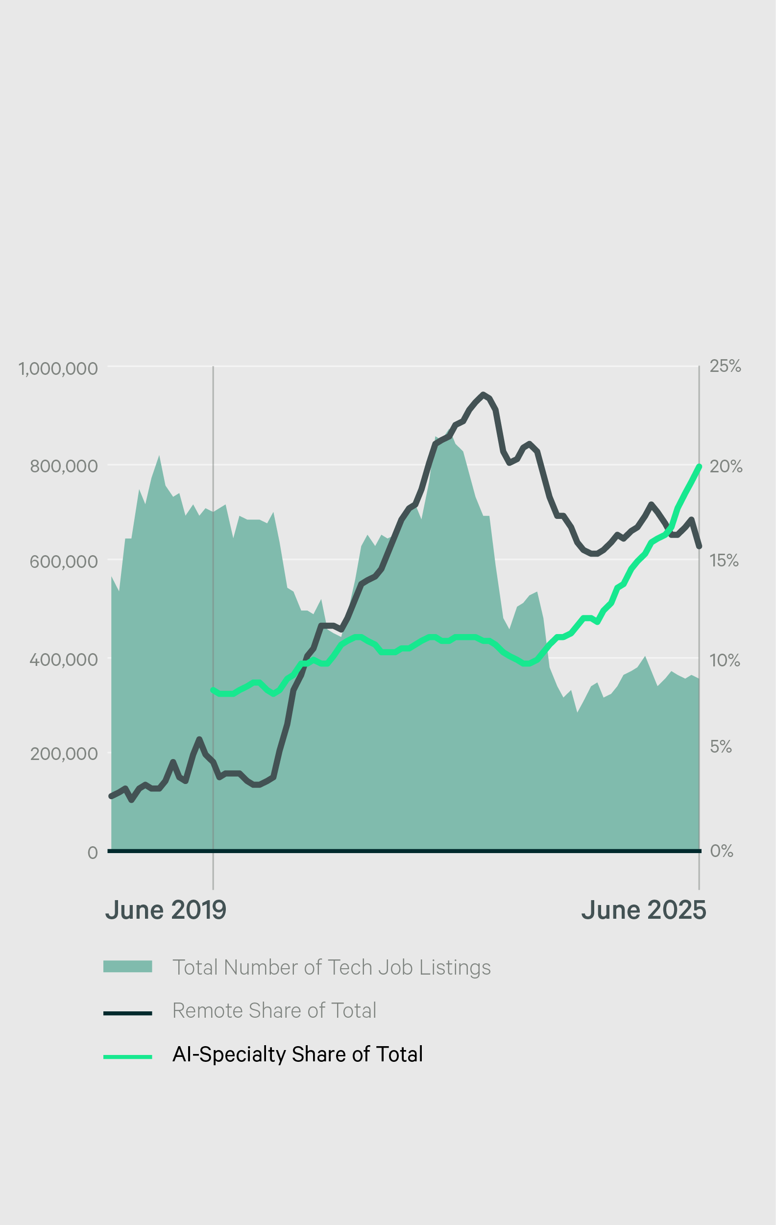 The share of AI-related job postings has doubled to 20% of available U.S. tech talent jobs.