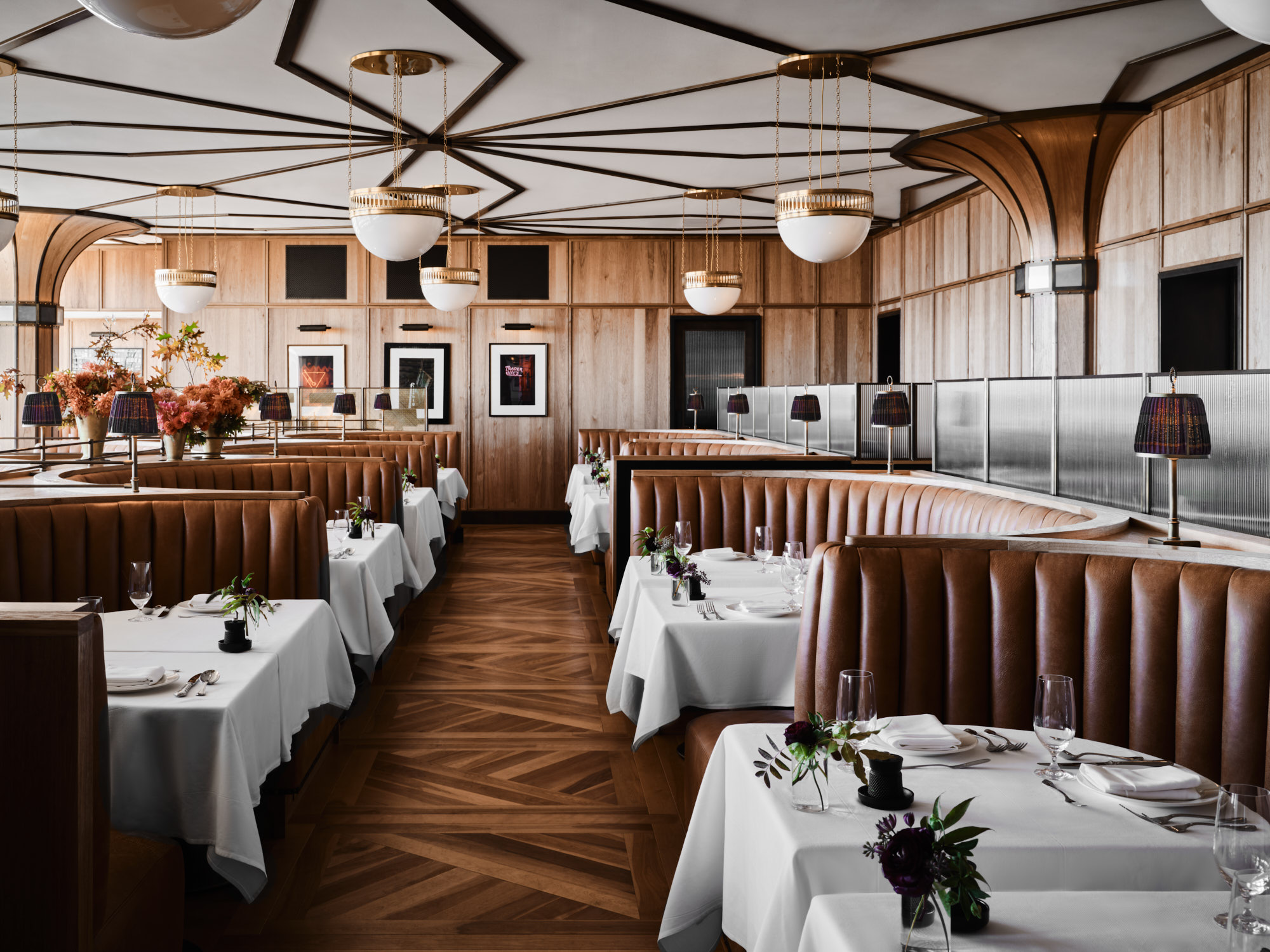 The main dining room exhibits a mid-century Californian glamour, with a timeless yet dramatic style. Caramel leather booths, floor-to-ceiling fluted columns and hand-crafted burnished accents surround low banquettes all made to feel like “the power table”. Custom chandeliers, including a large tassel drum chandelier in the private dining room, give the space a moody ambience, offset with pops of colour from the turquoise mohair seating and Californian quail and poppy velvet curtains. Elsewhere, the bar and lounge offer a contrastingly contemporary aesthetic, providing a lively atmosphere in the former, and a more discreet, relaxed feel in the latter.