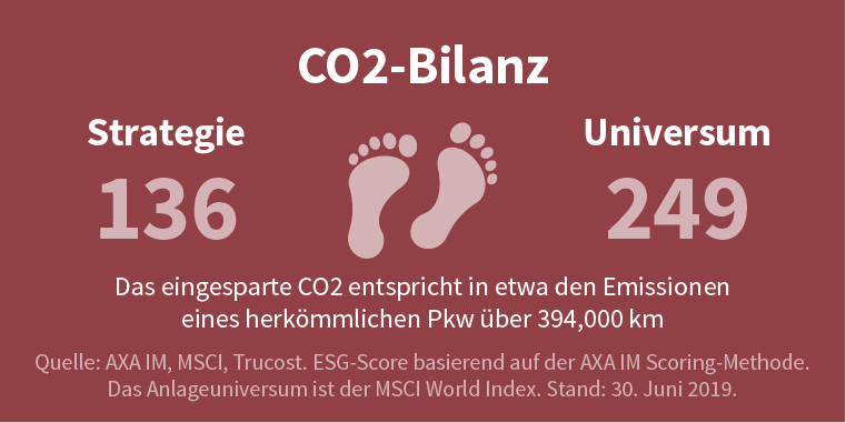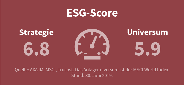 Wir verbessern die Fundamentaldaten des Portfolios zudem, indem wir ESG-Informationen für jede Aktie mit einbeziehen, die wir behandeln. Wir sind der Ansicht, dass ESG-Informationen ausschlaggebend für das Verständnis der Zukunftsaussichten eines Unternehmens sind. Daher ist es wichtig, ESG neben Qualitäts- und Volatilitätsmerkmalen zu berücksichtigen. Wir stellen sicher, dass die Strategie die AXA-IM-ESG-Standards erfüllt und einen ESG-Wert liefert, der über der Benchmark liegt, sowie eine optimierte CO2- und Wasserintensität aufweist. Als aktive Hüter Ihres Vermögens steht AXA IM zudem mit den Unternehmen, in die wir investieren, im Dialog.*