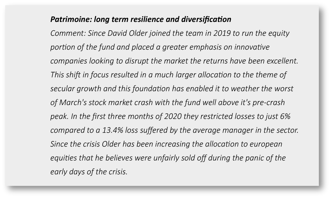 ADVERTISING MATERIAL. For professional investors only. Source: Carmignac, Citywire 30/09/2020 Carmignac Patrimoine is a common fund in contractual form (FCP) conforming to the UCITS Directive under French law. Risk Scale from the KIID (Key Investor Information Document) from 1 (lowest risk) to 7 (highest risk). Risk 1 does not mean a risk-free investment. This indicator may change over time. The Funds may have specific investment limits, as mentioned in their respective prospectuses. The Fund aims to outperform its reference indicator over a period exceeding three years. The composite reference indicator is comprised as follows: 50% MSCI AC WORLD NR (USD) index, and 50% Citigroup WGBI All Maturities index calculated with coupons reinvested. The Fund presents a risk of loss of capital. Main risks of Carmignac Patrimoine - EQUITY: The Fund may be affected by stock price variations, the scale of which is dependent on external factors, stock trading volumes or market capitalization. INTEREST RATE: Interest rate risk results in a decline in the net asset value in the event of changes in interest rates. CREDIT: Credit risk is the risk that the issuer may default. CURRENCY: Currency risk is linked to exposure to a currency other than the Fund’s valuation currency, either through direct investment or the use of forward financial instruments. This content may not be reproduced, in whole or in part, without prior authorisation from the management company. This content does not constitute a subscription offer, nor does it constitute investment advice. Access to the Fund may be subject to restrictions with regard to certain persons or countries. The Fund is not registered in North America, in South America, in Asia nor is it registered in Japan. The Funds are registered in Singapore as restricted foreign scheme (for professional clients only). The Fund has not been registered under the US Securities Act of 1933. The Fund may not be offered or sold, directly or indirectly, for the benefit or on behalf of a "U.S. person", according to the definition of the US Regulation S and/or FATCA. The Fund presents a risk of loss of capital. The risks and fees are described in the KIID (Key Investor Information Document). The Fund's prospectus, KIIDs and annual reports are available at www.carmignac.com, or upon request to the Management Company. The KIID must be made available to the subscriber prior to subscription. ● In Switzerland, the Fund’s respective prospectuses, KIIDs and annual reports are available at www.carmignac.ch, or through our representative in Switzerland, CACEIS (Switzerland) S.A., Route de Signy 35, CH-1260 Nyon. The paying agent is CACEIS Bank, Paris, succursale de Nyon/Suisse, Route de Signy 35, 1260 Nyon. ● In the United Kingdom, the Funds’ respective prospectuses, KIIDs and annual reports are available at www.carmignac.co.uk, or upon request to the Management Company, or for the French Funds, at the offices of the Facilities Agent at BNP PARIBAS SECURITIES SERVICES, operating through its branch in London: 55 Moorgate, London EC2R. This material was prepared by Carmignac Gestion and/or Carmignac Gestion Luxembourg and is being distributed in the UK by Carmignac Gestion Luxembourg UK Branch (Registered in England and Wales with number FC031103, CSSF agreement of 10/06/2013). Carmignac Gestion – 24 place Vendôme – F-75001 Paris. Tel: (+33) 01 42 86 53 35 – Investment management company approved by the AMF – Public limited company with share capital of € 15,000,000 – RCS Paris B 349 501 676. Carmignac Gestion Luxembourg – City Link – 7, rue de la Chapelle – L-1325 Luxembourg – Tel: (+352) 46 70 60 1 – Subsidiary of Carmignac Gestion – Investment fund management company approved by the CSSF – Public limited company with share capital of €23,000,000 – RC Luxembourg B 67 549.