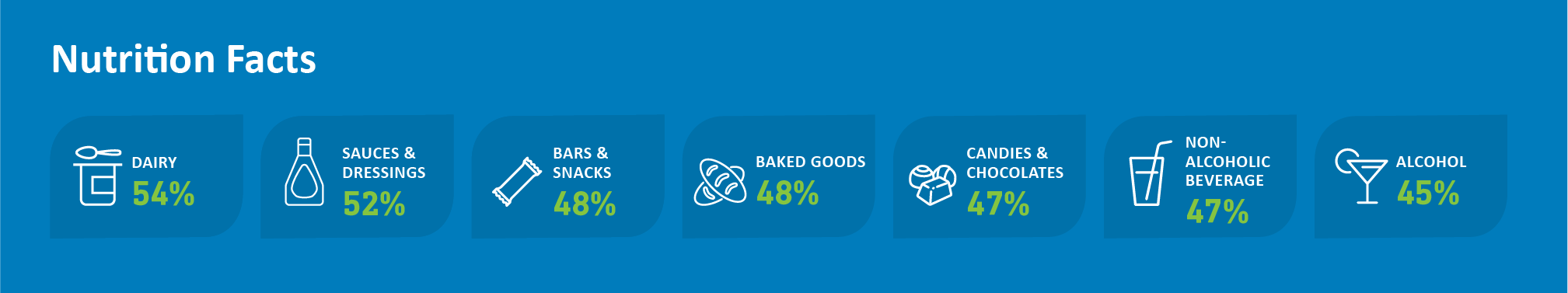 Products seen most with the label: 59% Chocolates 52% Non-Alcoholic Beverages 48% Cereals 47% Sweet Candies 42% Snacks 42% Dairy
