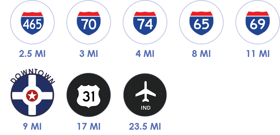 Immediate access to I-465, less than 4 miles to I-70 & I-74