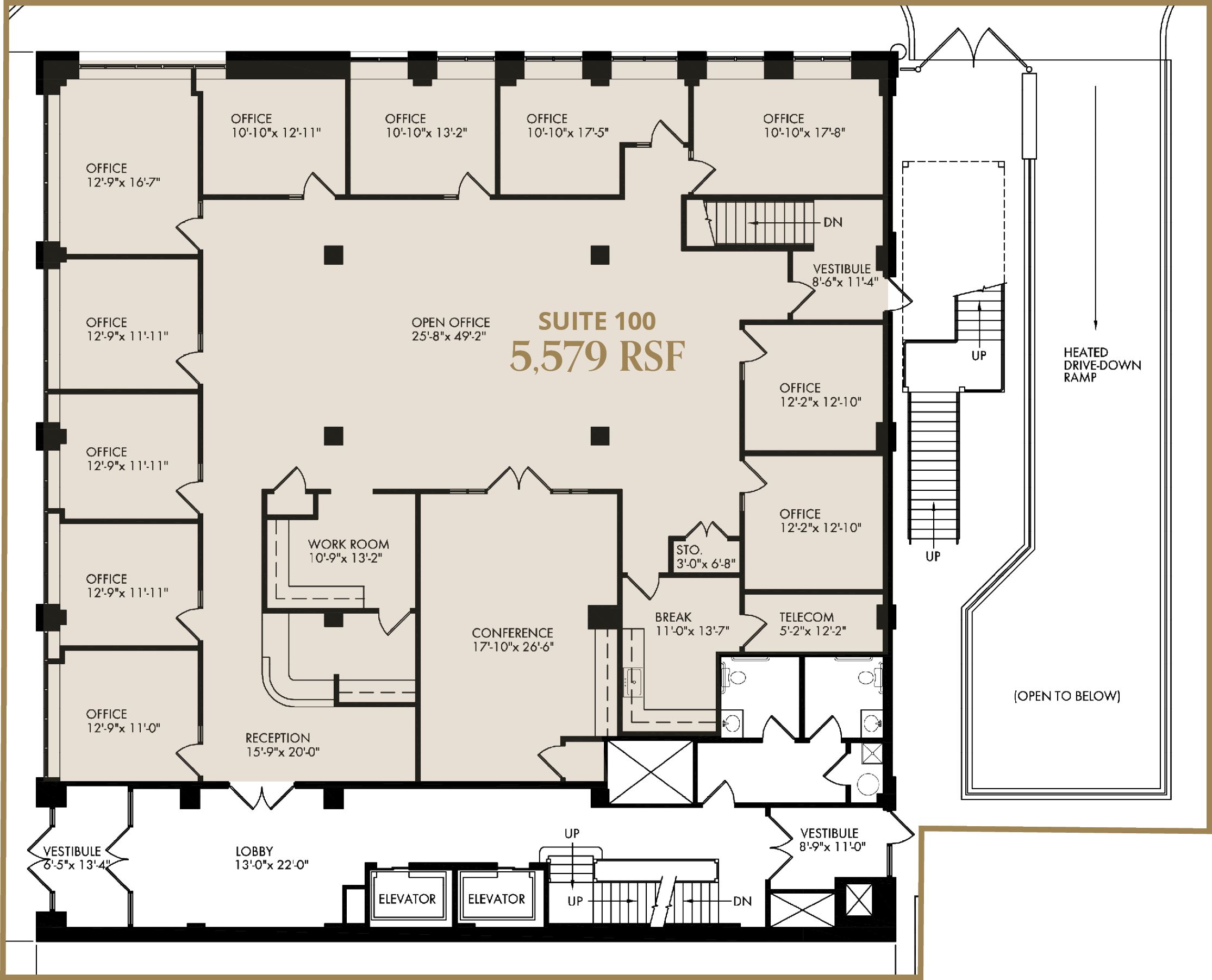 On-site convenience: kitchenette & breakroom, client lounge, sub-surface parking with heated entrance ramp, fitness center with private showers & locker room, and key fob for secure entrance to building, suites & restrooms
