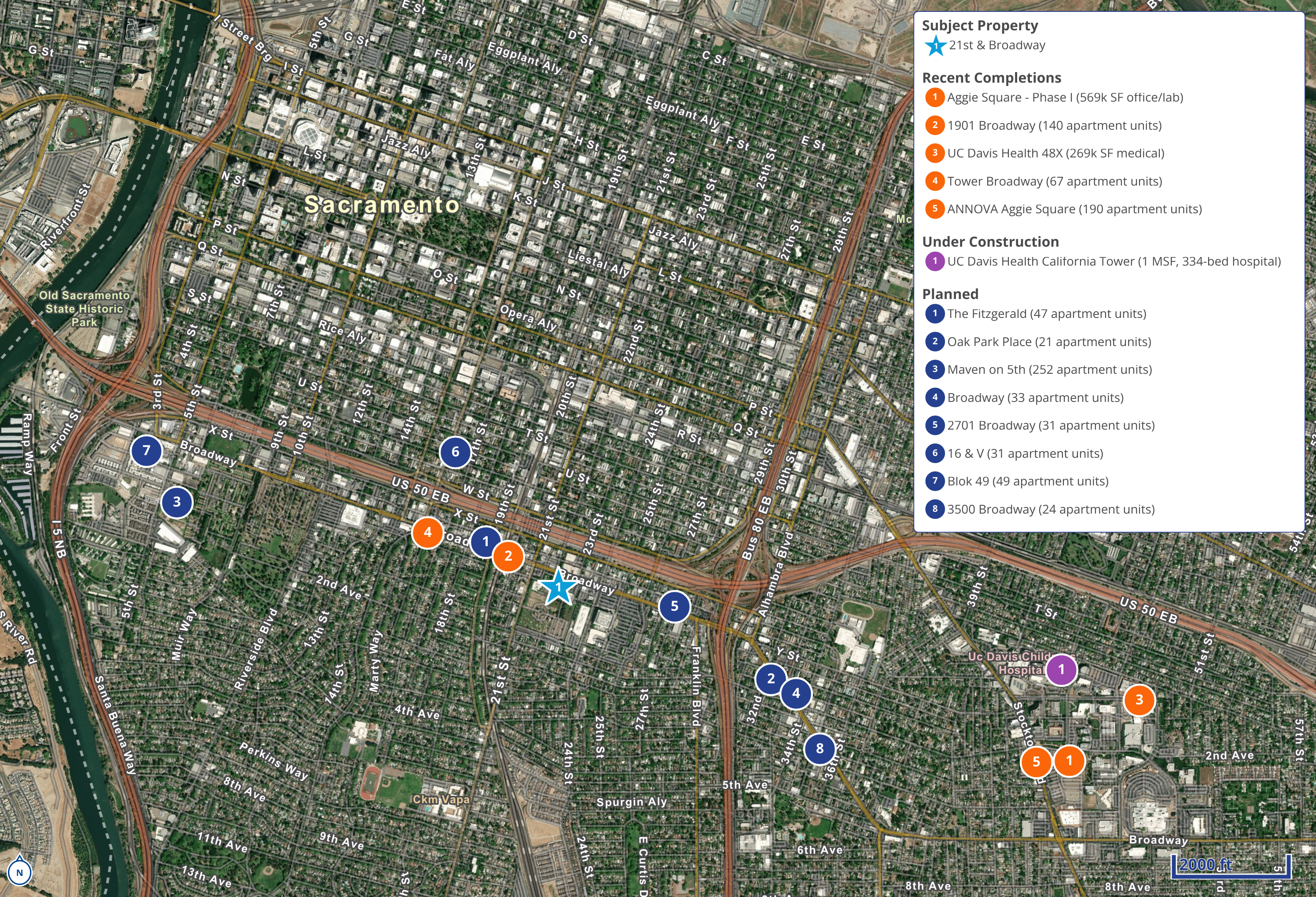 Further strengthening the corridor is the California Northstate University College of Dental Medicine’s Sacramento campus and Oral Health Care Center along Broadway. The facility features a large-scale clinical training environment serving both students and the public, generating consistent daily traffic from patients, faculty, and staff. As a healthcare-focused institutional use, it reinforces the area’s expanding medical and education cluster, complementing UC Davis Medical Center and Aggie Square. This concentration of institutional uses continues to drive demand for workforce housing, neighborhood-serving retail, and service-oriented amenities, supporting long-term mixed-use development fundamentals in the immediate area.