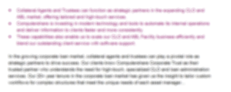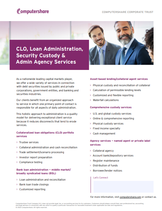 In the growing corporate loan market, collateral agents and trustees can play a pivotal role as strategic partners to drive success. Our clients know Computershare Corporate Trust as their trusted partner who understands the need for high-touch, specialized CLO and loan administration...