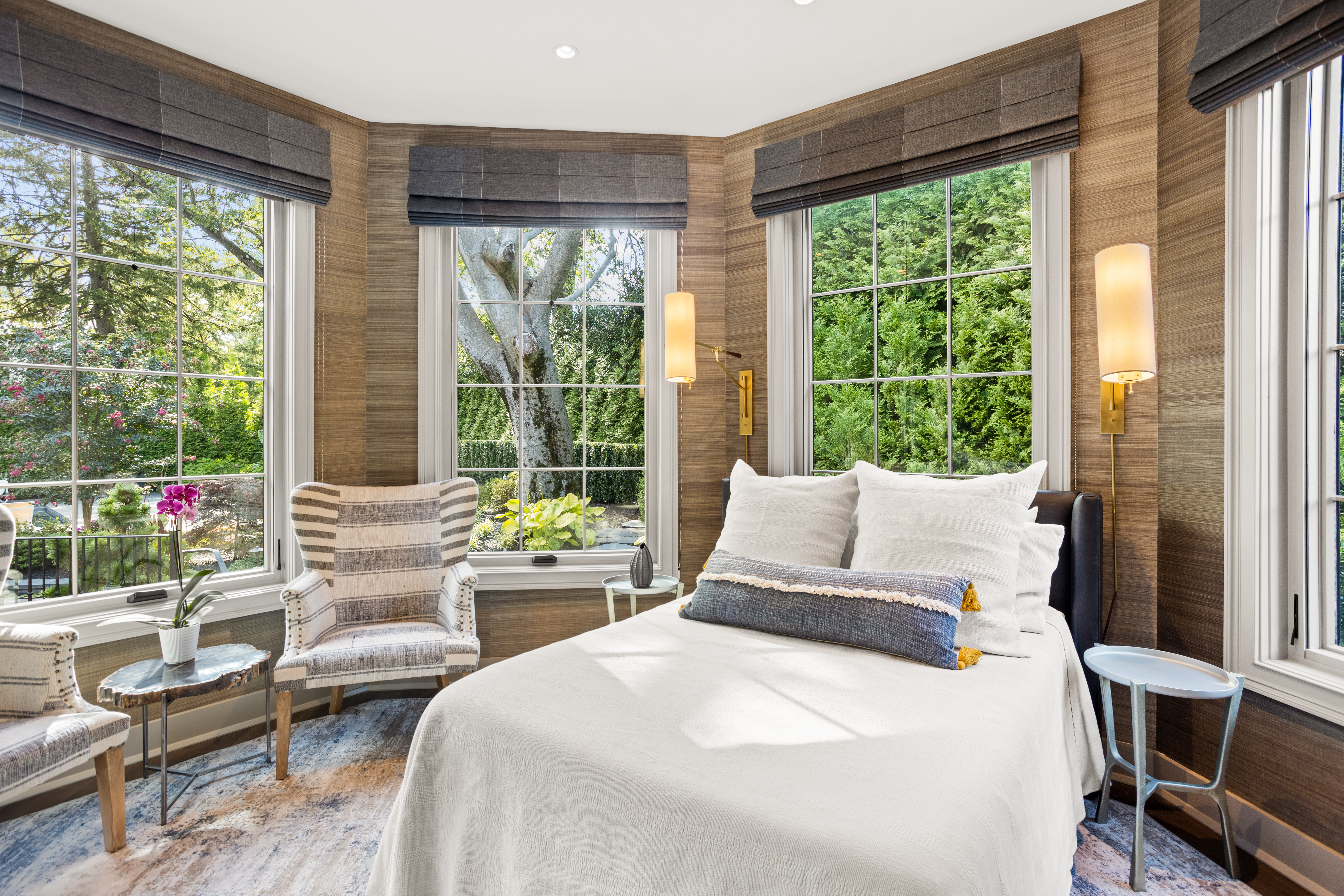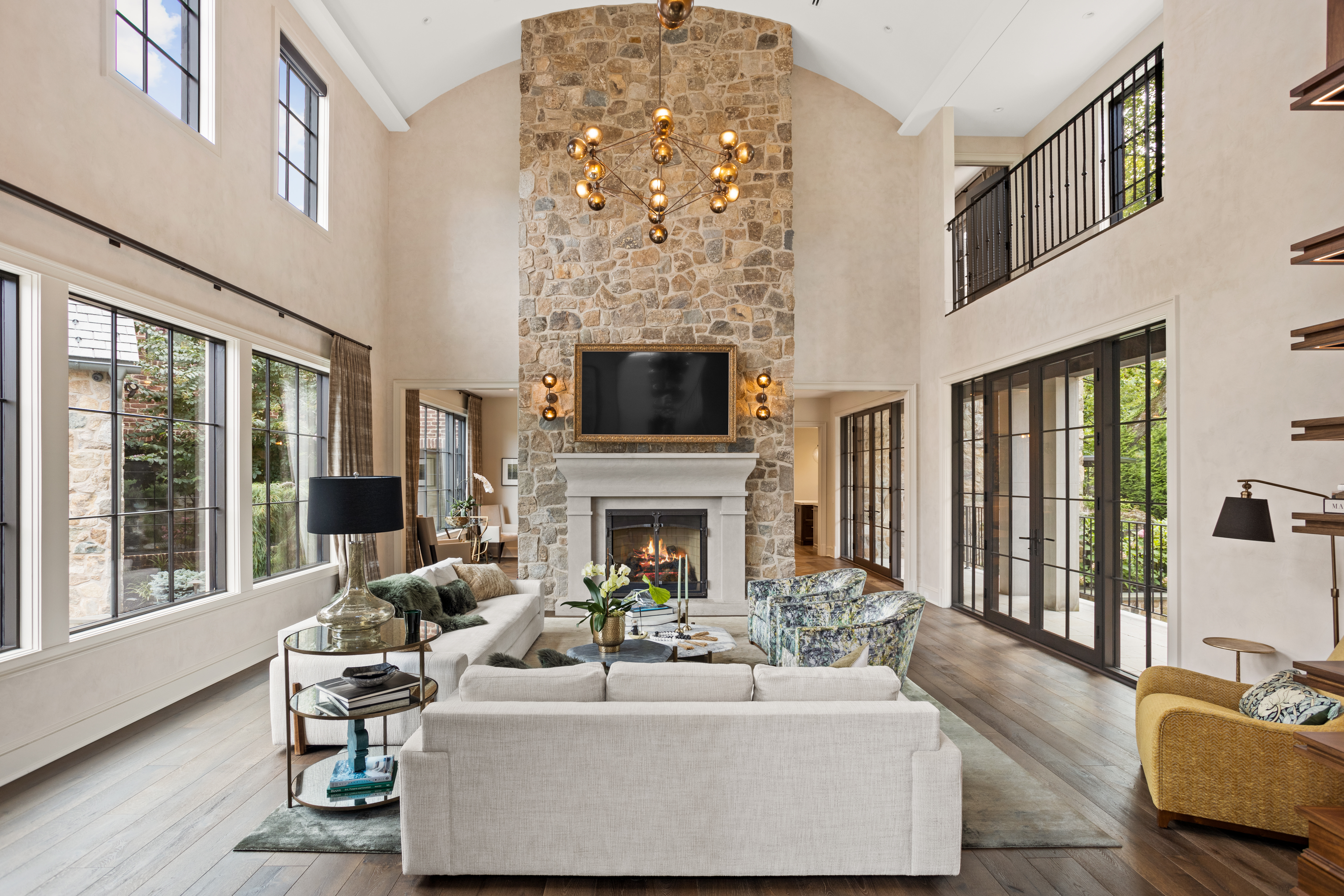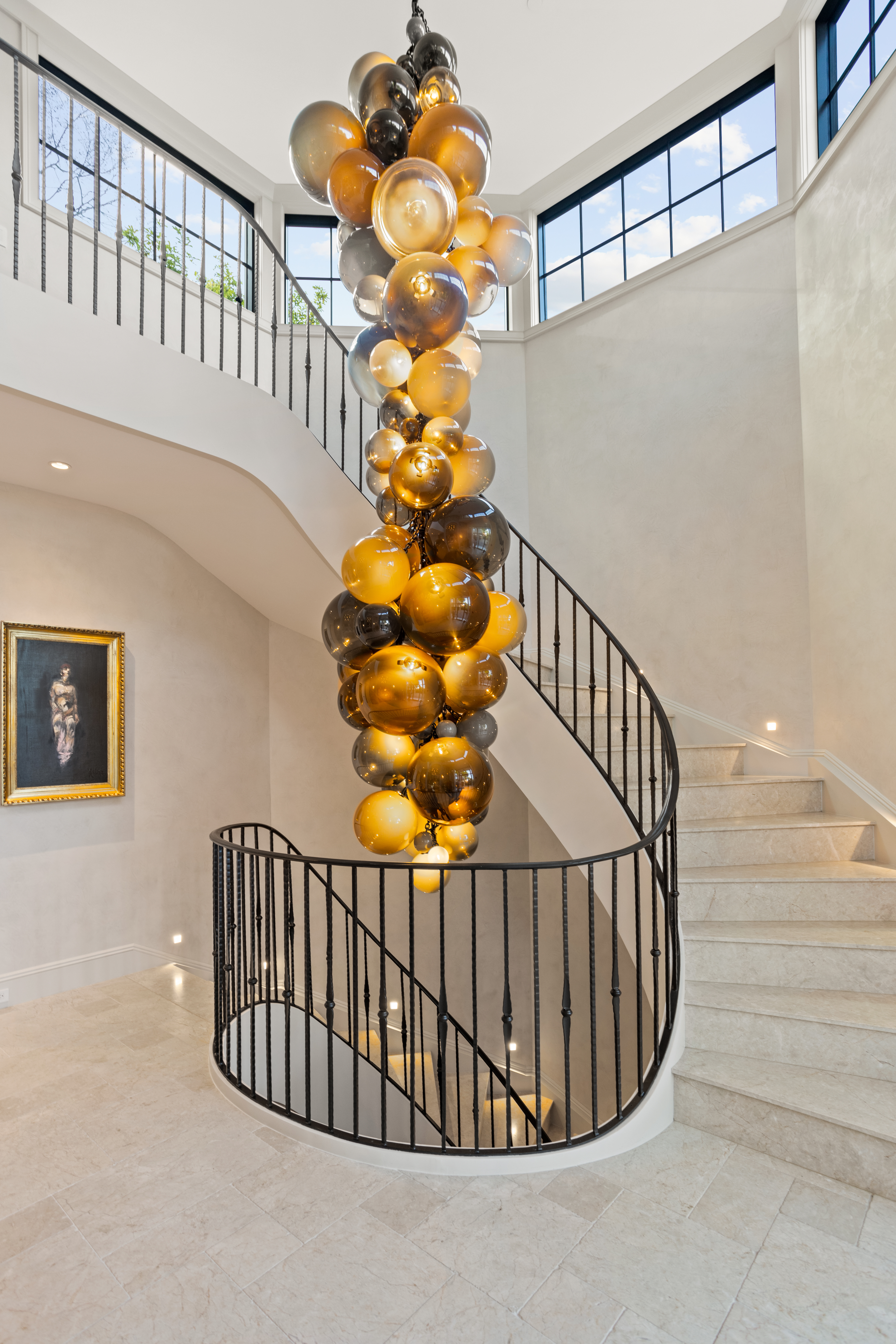 From the front door, you enter light and bright foyer with a show-stopping custom chandelier made of hand-blown glass and weighing 750 pounds — it was flown in from England and meticulously assembled on site piece by piece. To the left, the spacious great room offers double-height cathedral ceilings and a stone fireplace. The kitchen features discreet small appliance storage, a breakfast room with a stunning wall of windows overlooking the garden and La Cornue, Sub-Zero, and Gaggenau appliances.