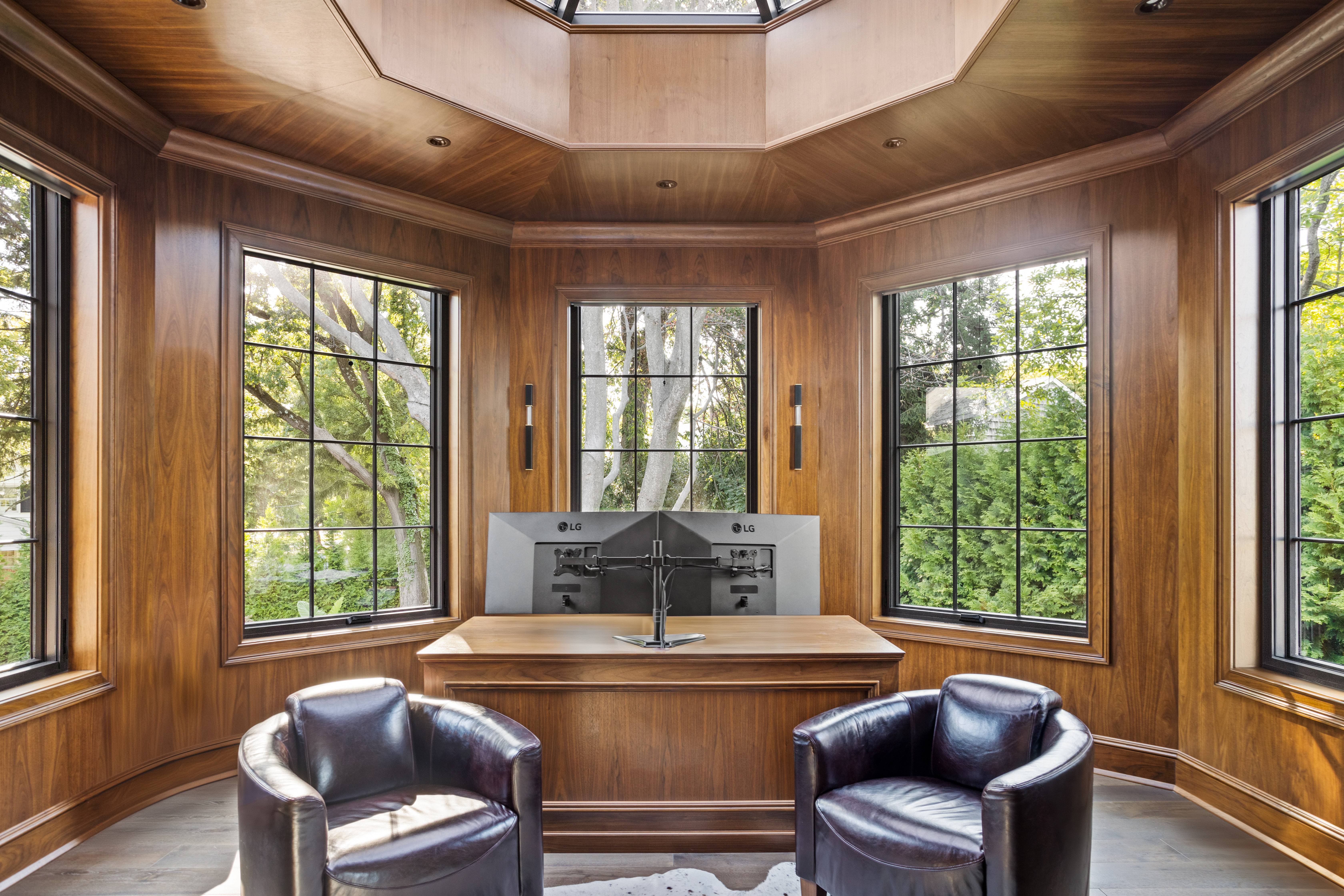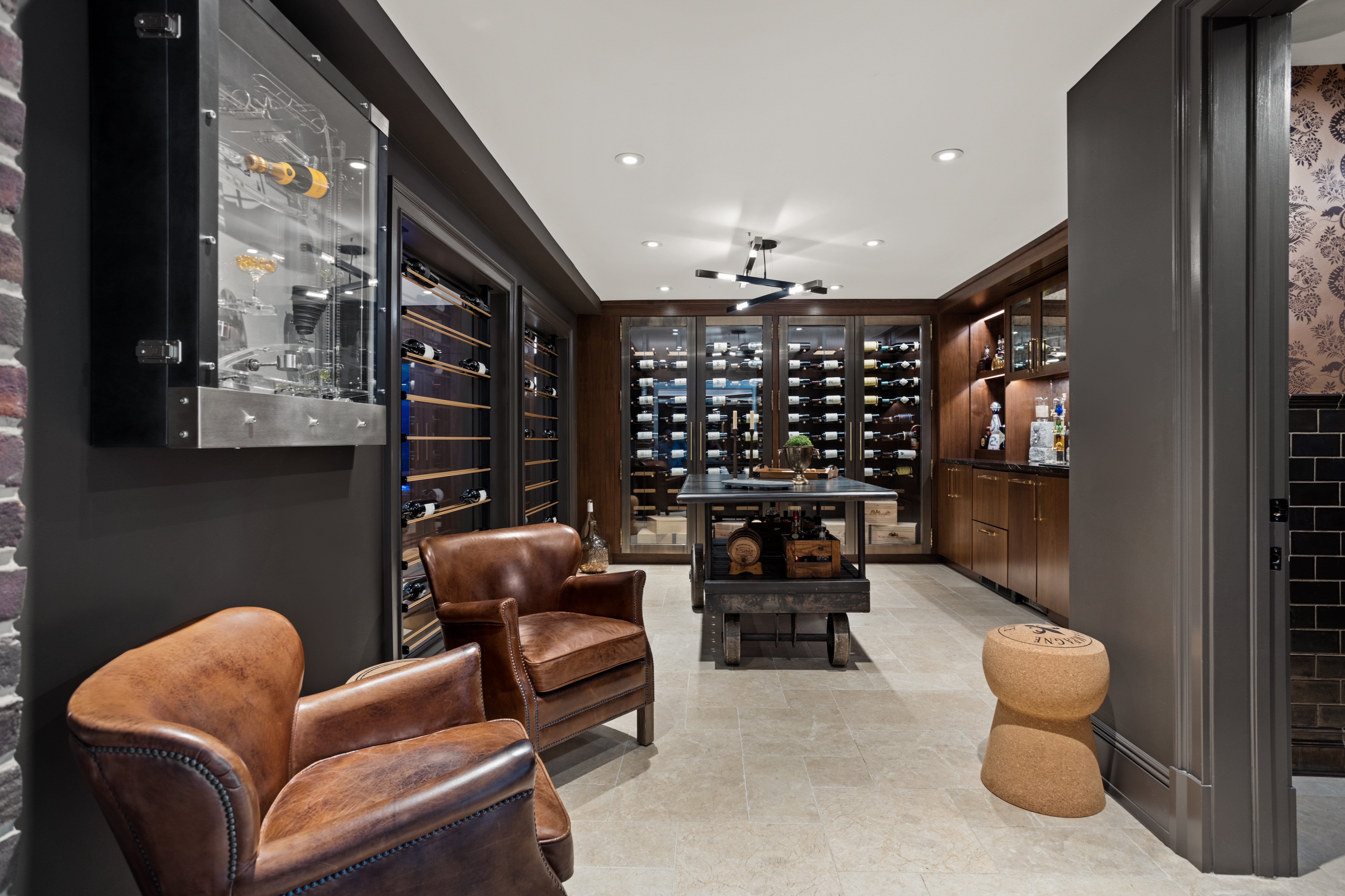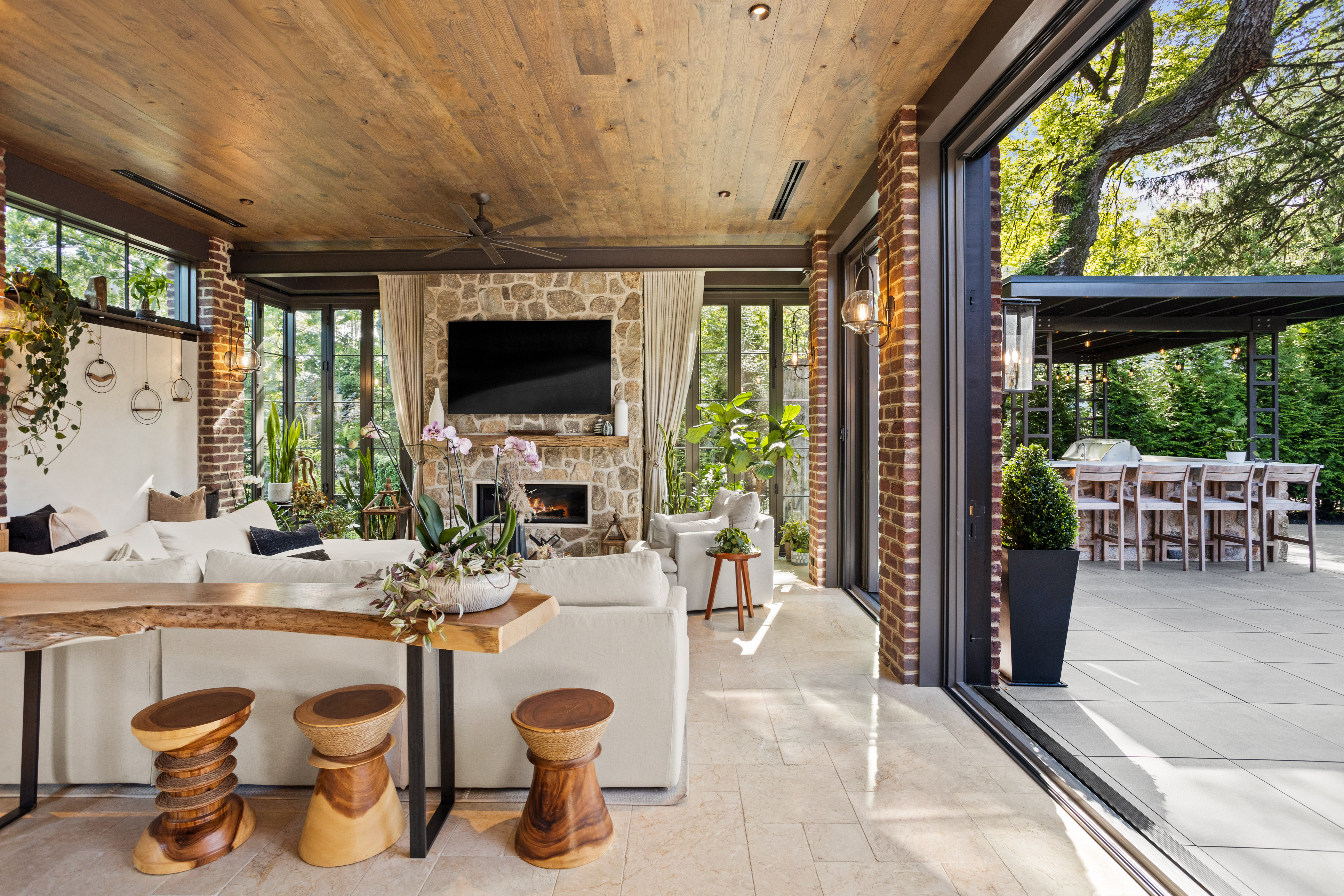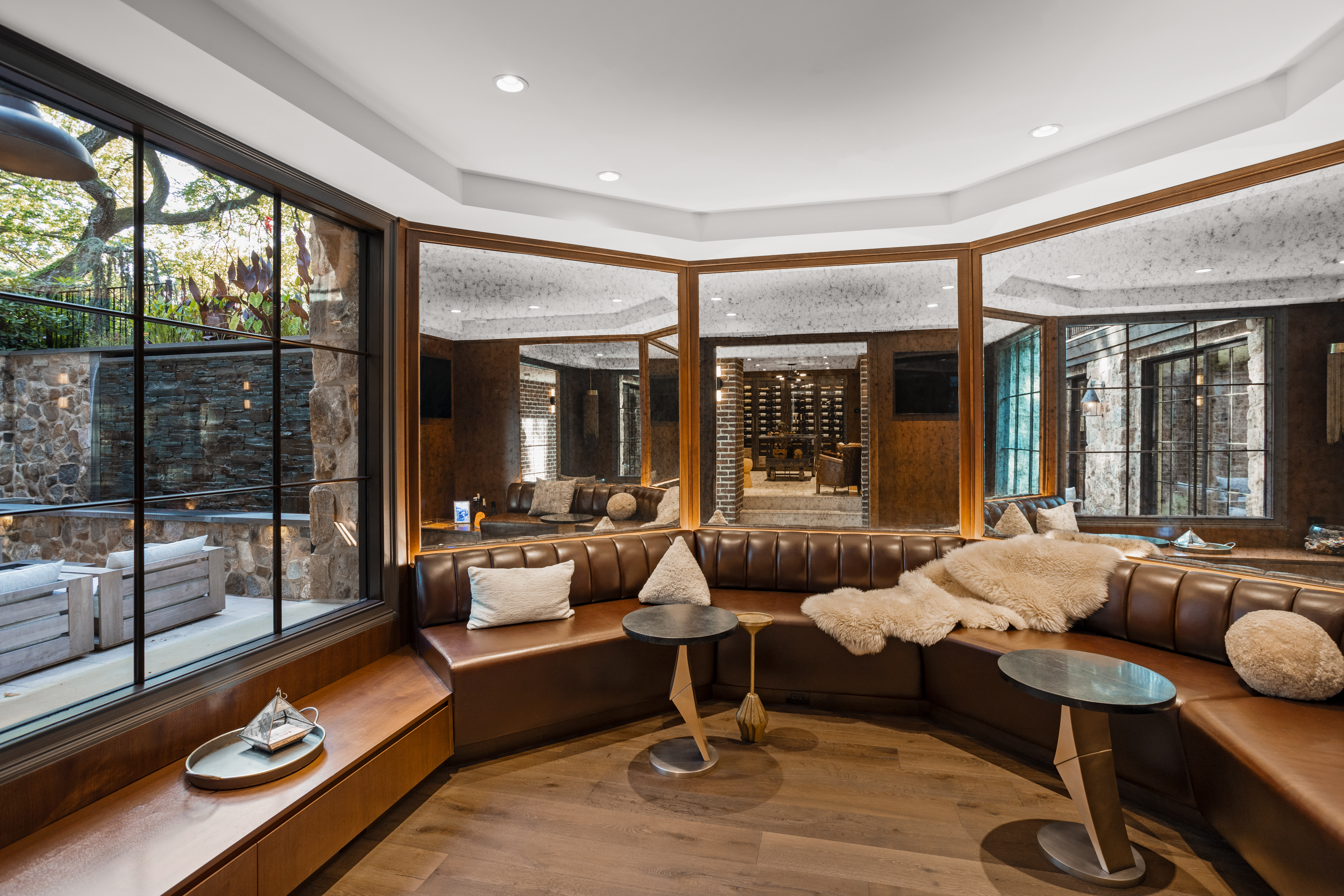 Calling it spacious would be an understatement. Conceived by Narofsky Architecture and Interiors, the home encompasses more than 11,000 square feet of interiors, with eight bedrooms, eight full bathrooms, and three powder rooms. It offers an elegant suite of amenities that rival some country clubs — a pool and spa, a koi pond with a waterfall, a courtyard with a fire pit, a media room, a butler’s pantry, and a “Florida Room” outfitted with a Loewen NanaWall system with hidden screens. The in-home wellness and entertainment floor boasts a spa with steam room and sauna, a wine room/cellar and bar, gaming/viewing lounges, a large fish tank, a hair salon, and an indoor-outdoor sport/basketball court and gym.