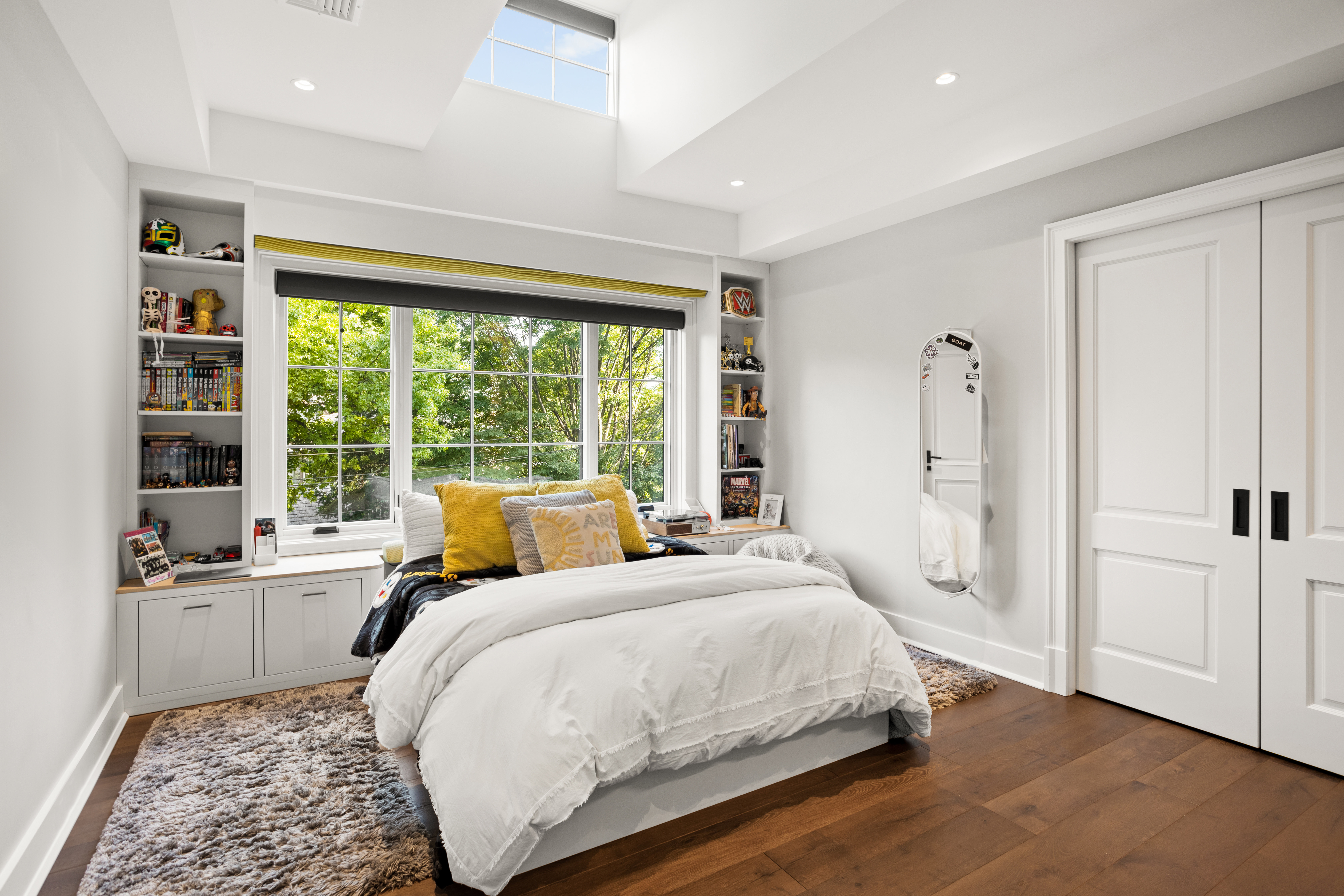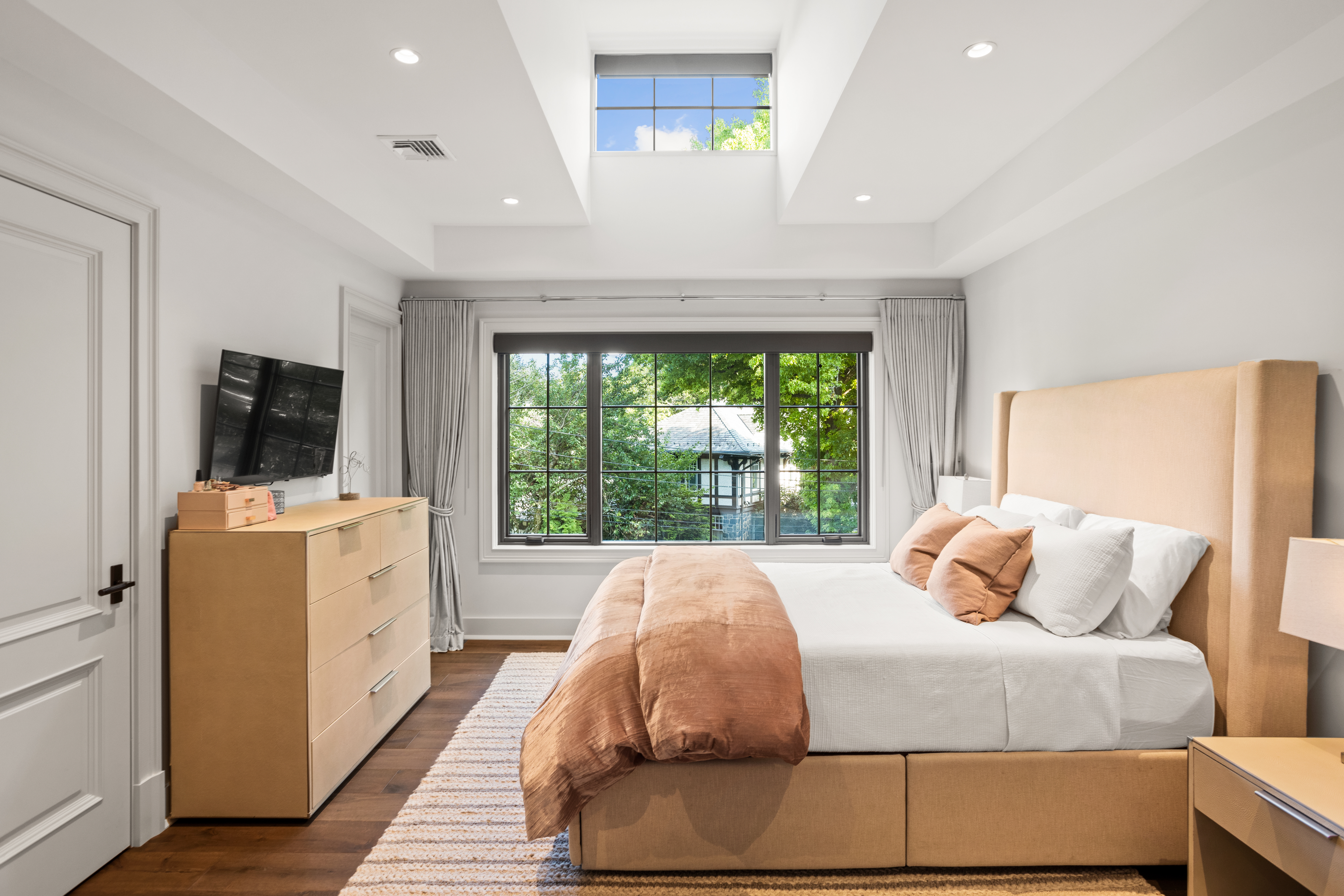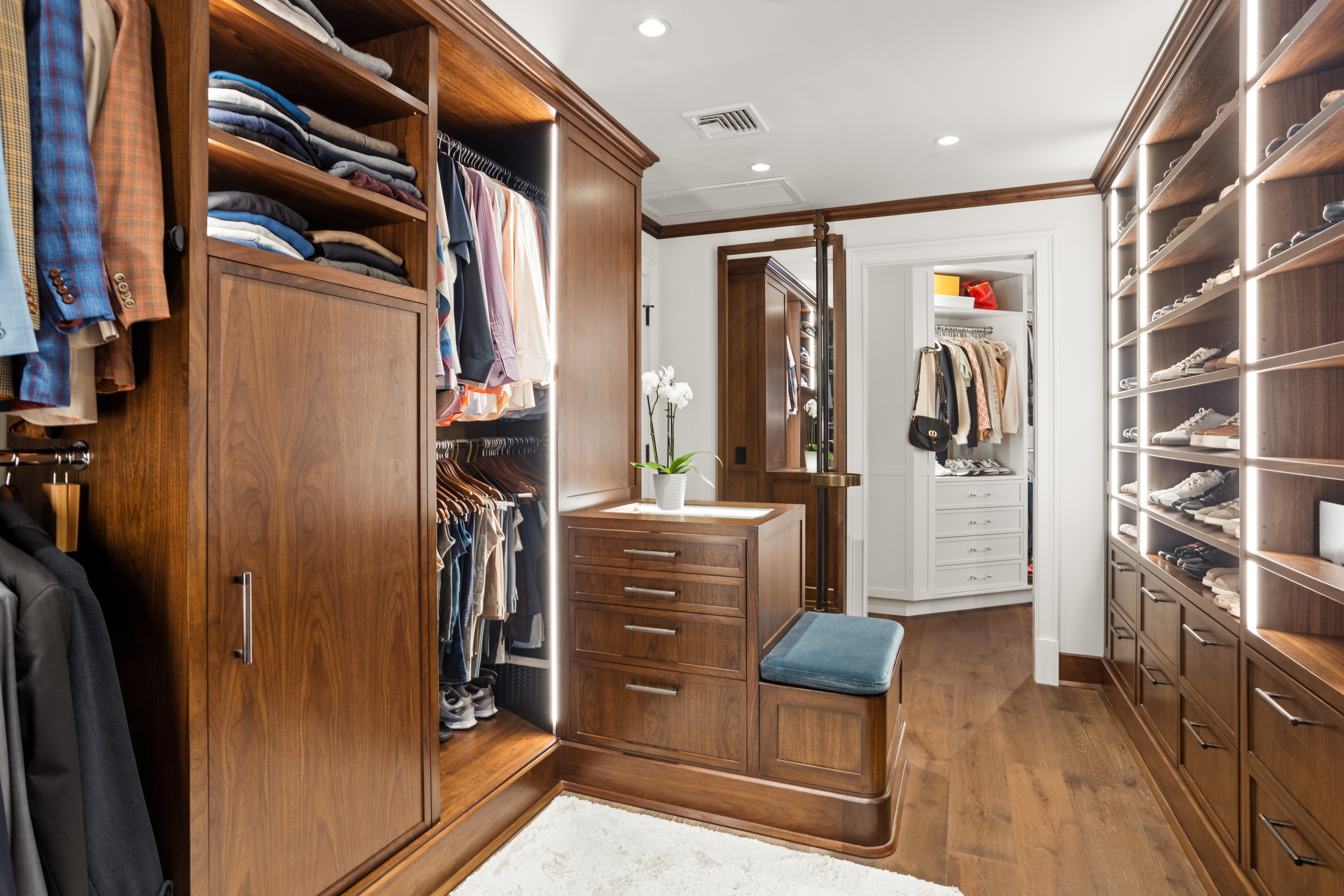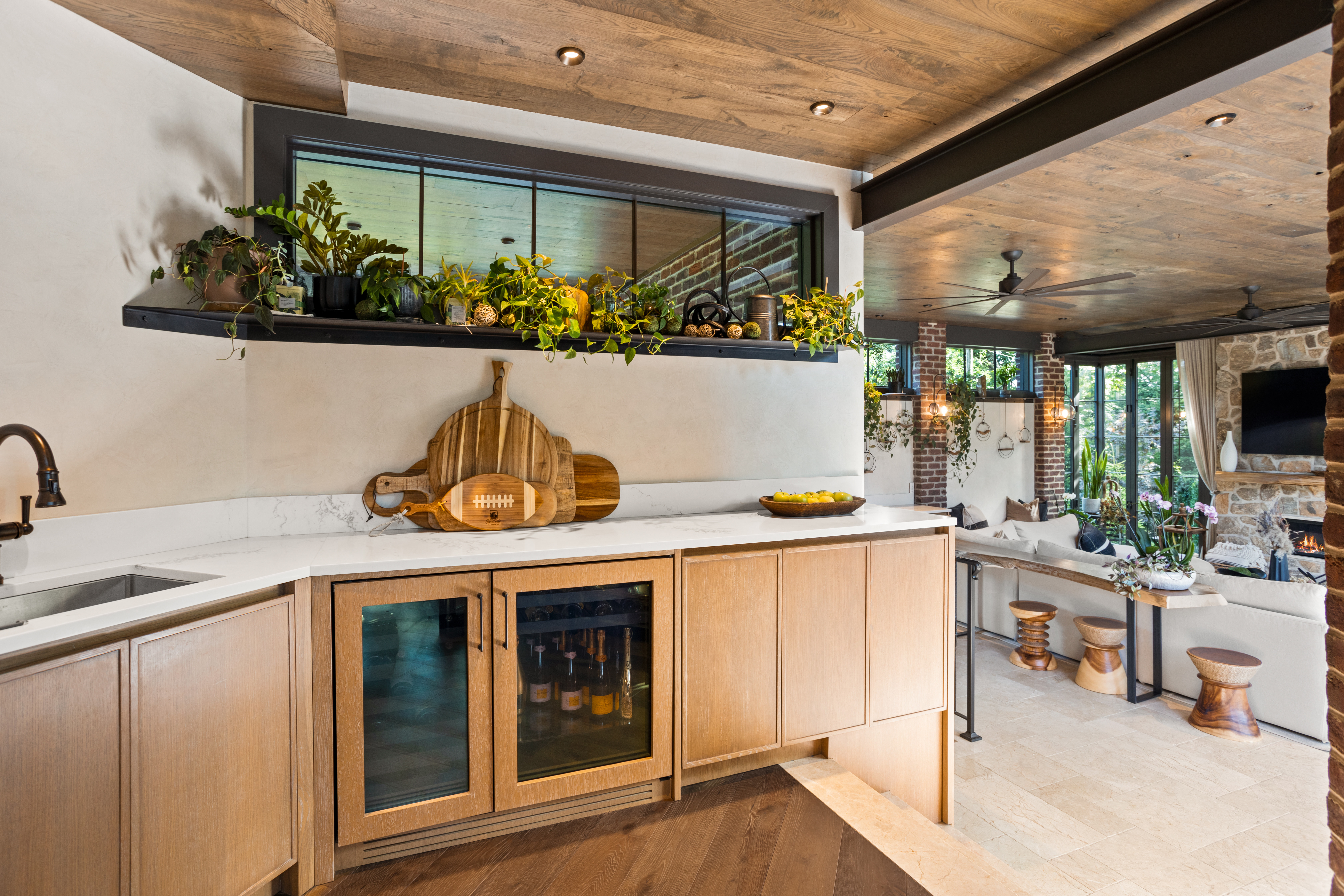 Calling it spacious would be an understatement. Conceived by Narofsky Architecture and Interiors, the home encompasses more than 11,000 square feet of interiors, with eight bedrooms, eight full bathrooms, and three powder rooms. It offers an elegant suite of amenities that rival some country clubs — a pool and spa, a koi pond with a waterfall, a courtyard with a fire pit, a media room, a butler’s pantry, and a “Florida Room” outfitted with a Loewen NanaWall system with hidden screens. The in-home wellness and entertainment floor boasts a spa with steam room and sauna, a wine room/cellar and bar, gaming/viewing lounges, a large fish tank, a hair salon, and an indoor-outdoor sport/basketball court and gym.