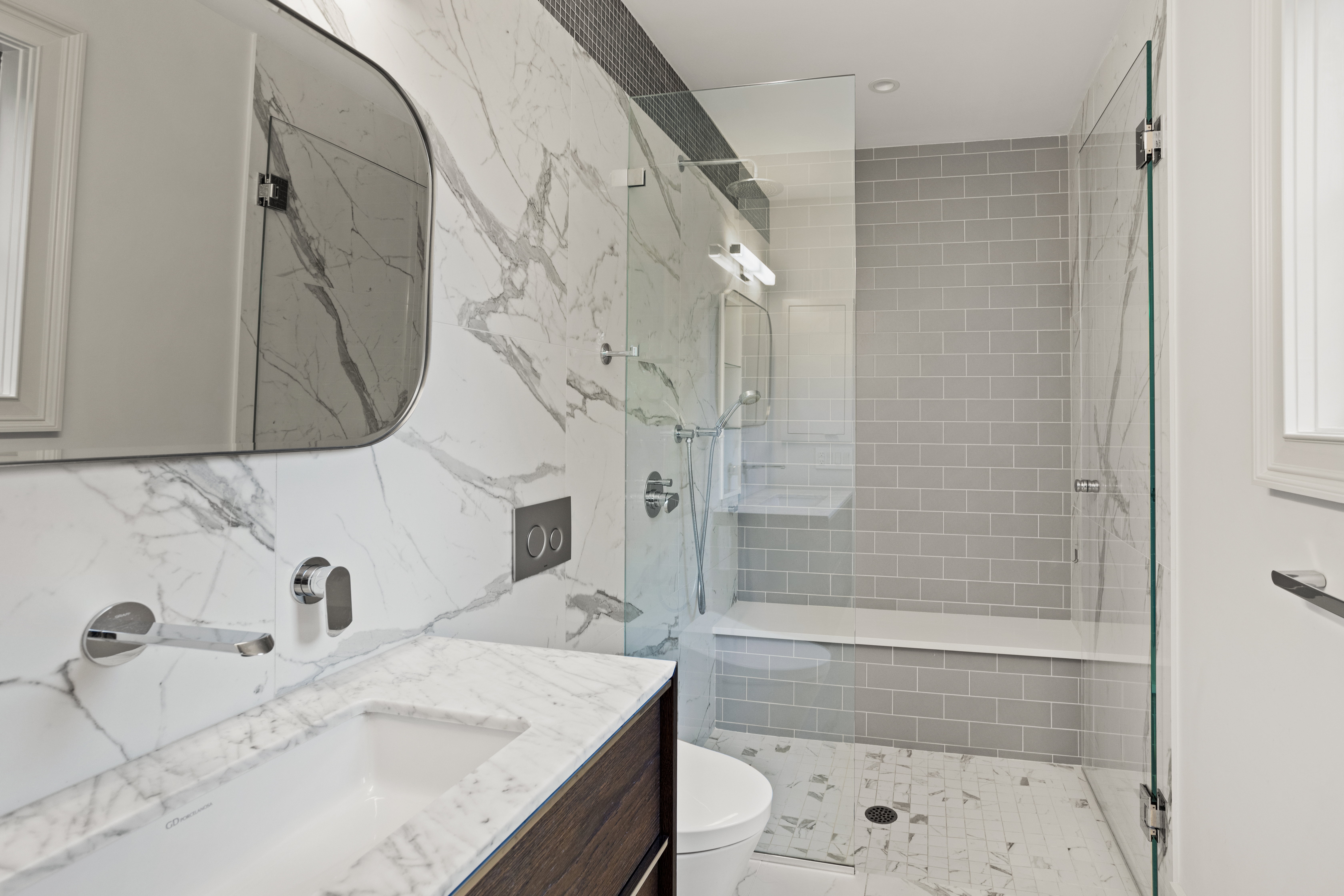 Upstairs, the primary bedroom suite offers dual dressing rooms and a lavish en suite marble bathroom with a deep soaking tub, a two-person shower, and a two-person vanity with a hidden TV in the mirror. This level holds another four bedroom suites, each with full bathrooms and walk-in closets, and a self-contained apartment.