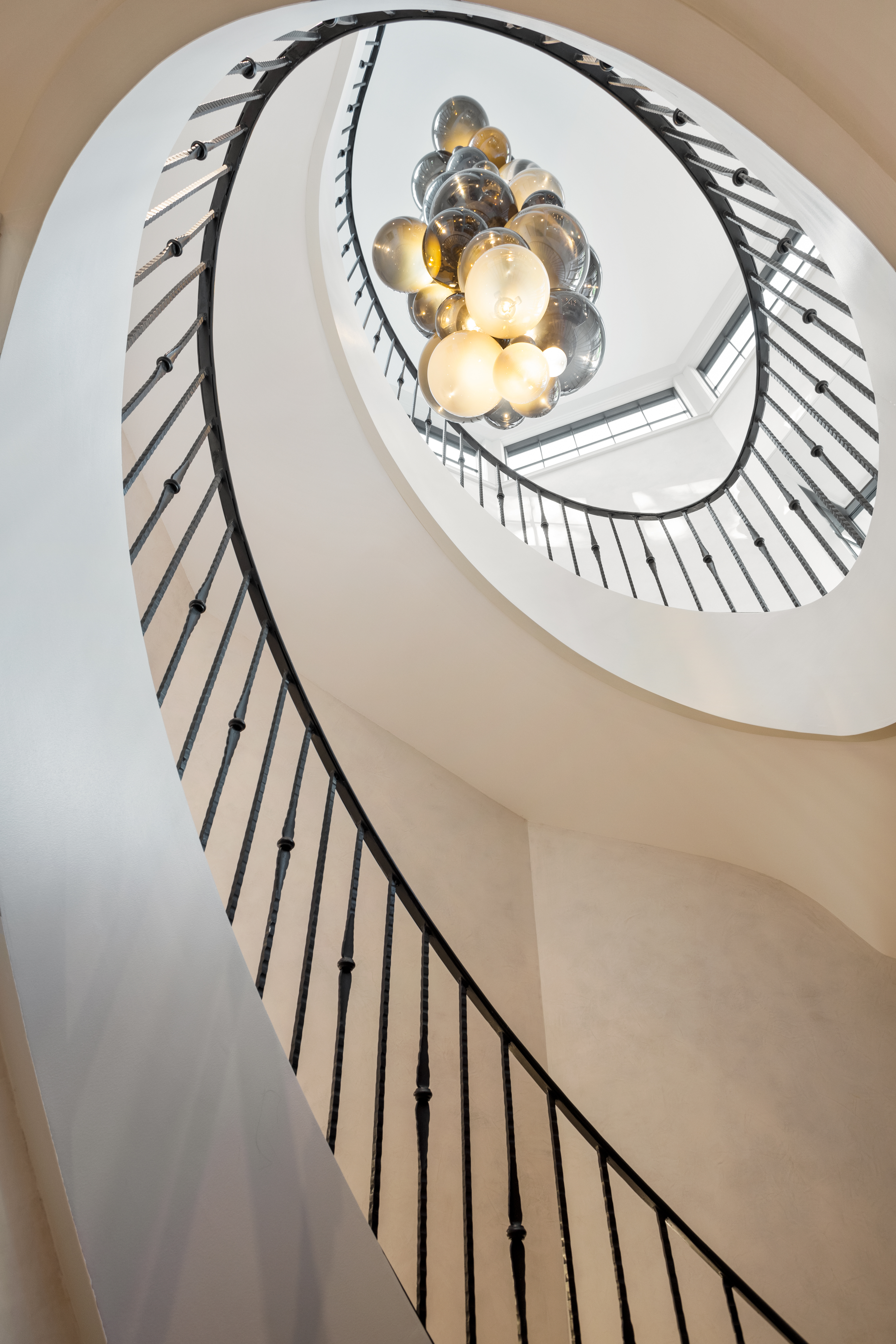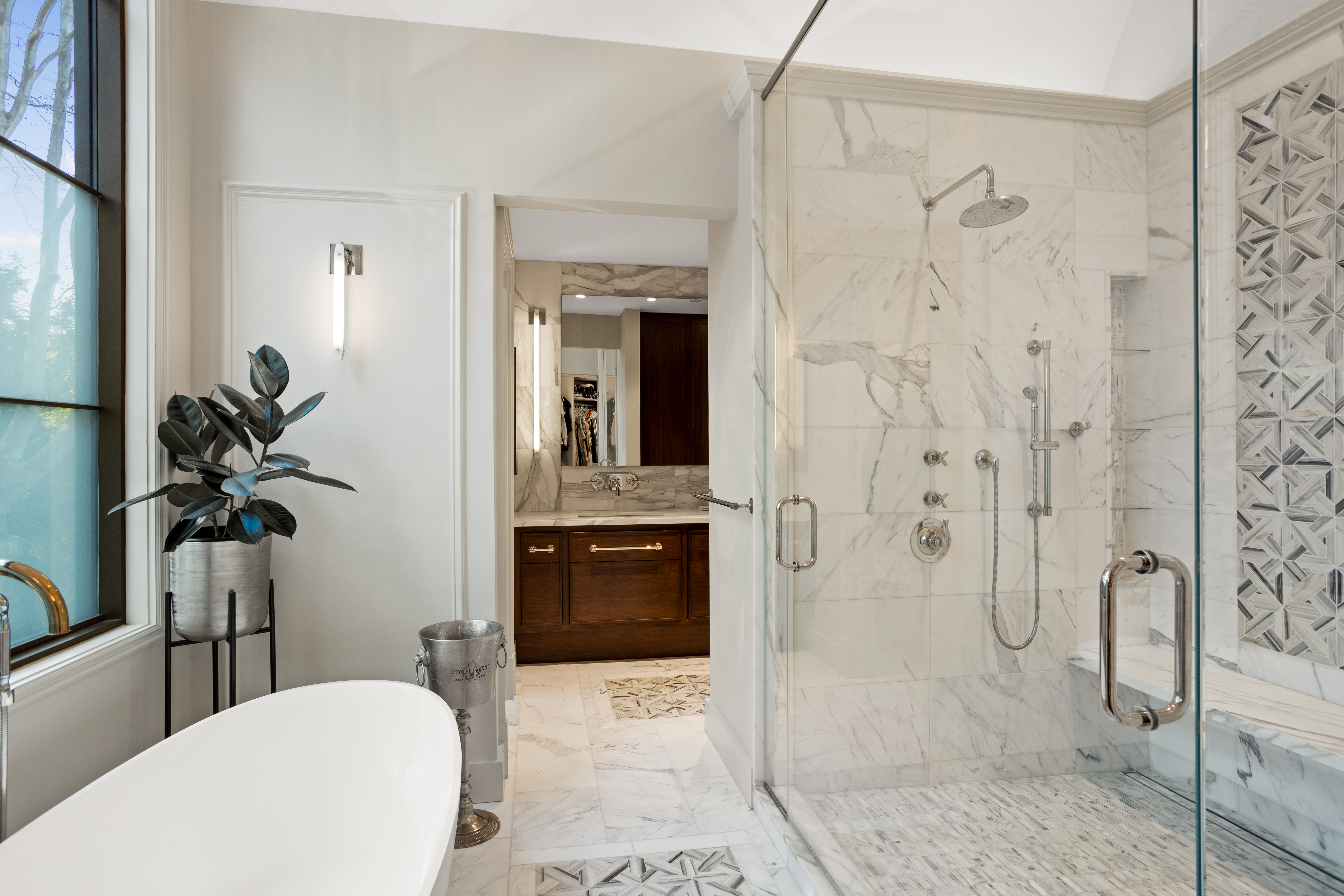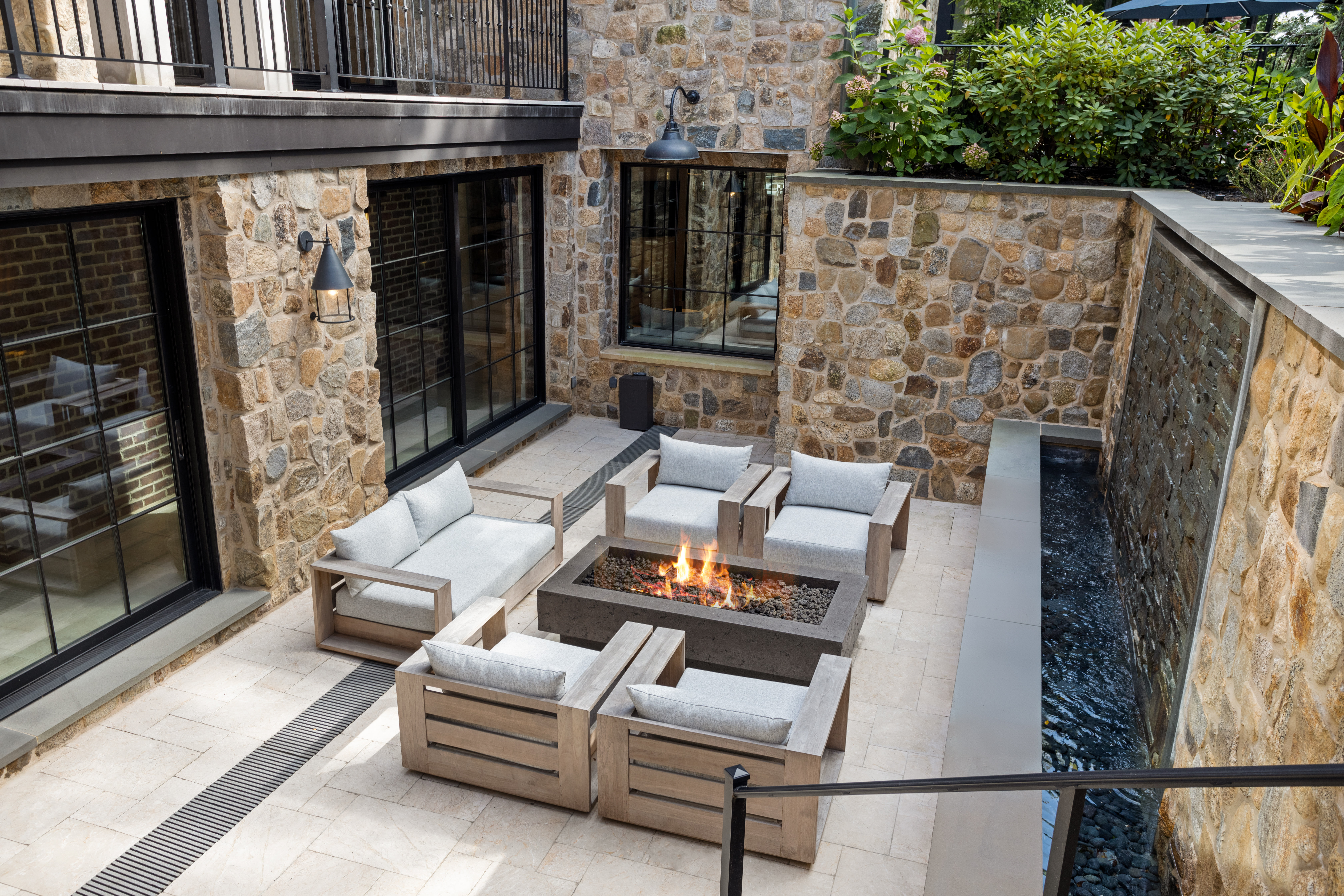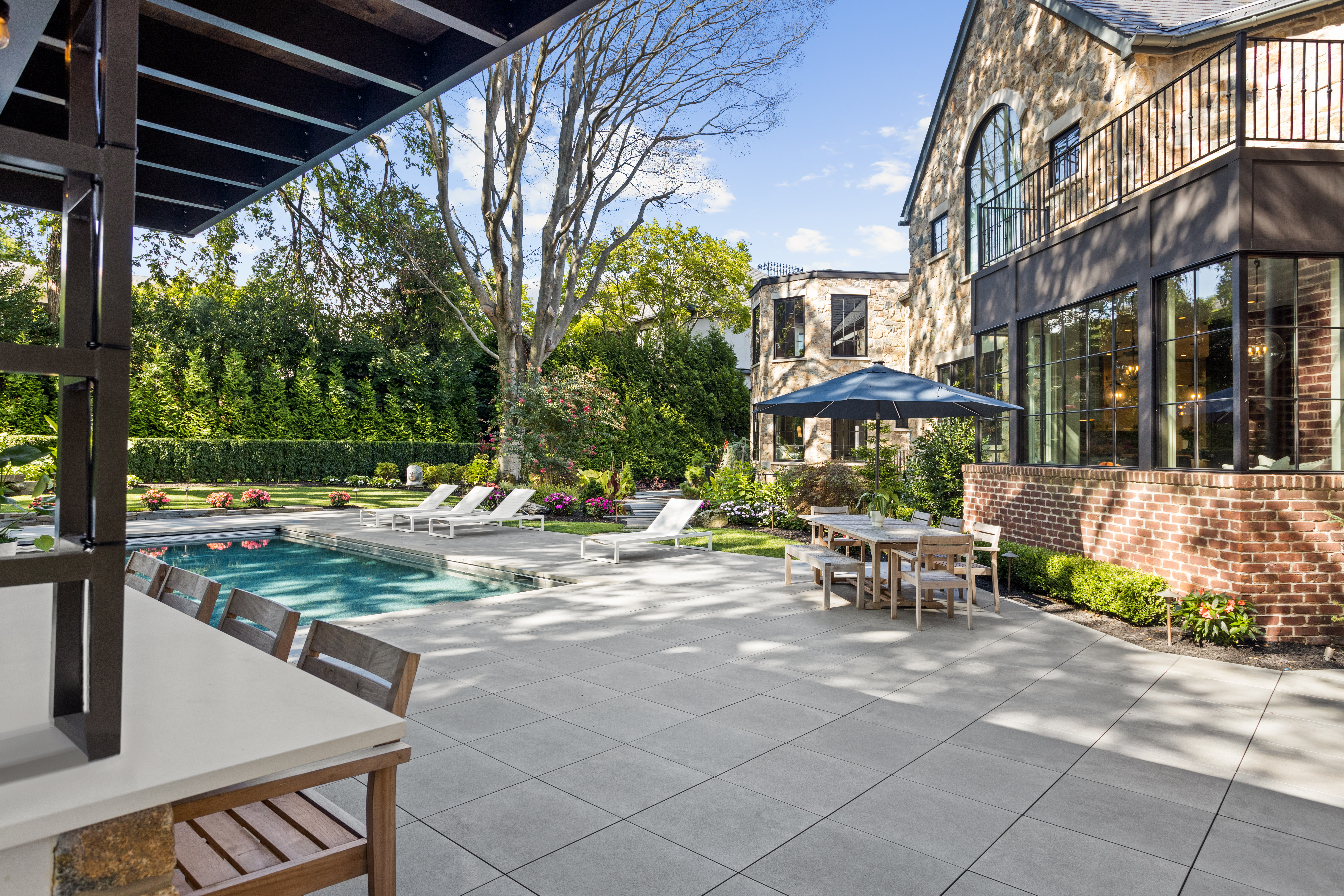 Built in 2021, this three-level European-style retreat on the half-acre lot at 176 Benedict Road is a relative newcomer in the storied enclave. Clad in Indiana limestone and reclaimed brick with a slate roof and zinc gutters and downspout, the home features radiant-heat flooring throughout, the latest in home automation, a three-car garage, walnut flooring and millwork, Venetian stucco walls, and Bucks County stone accents.