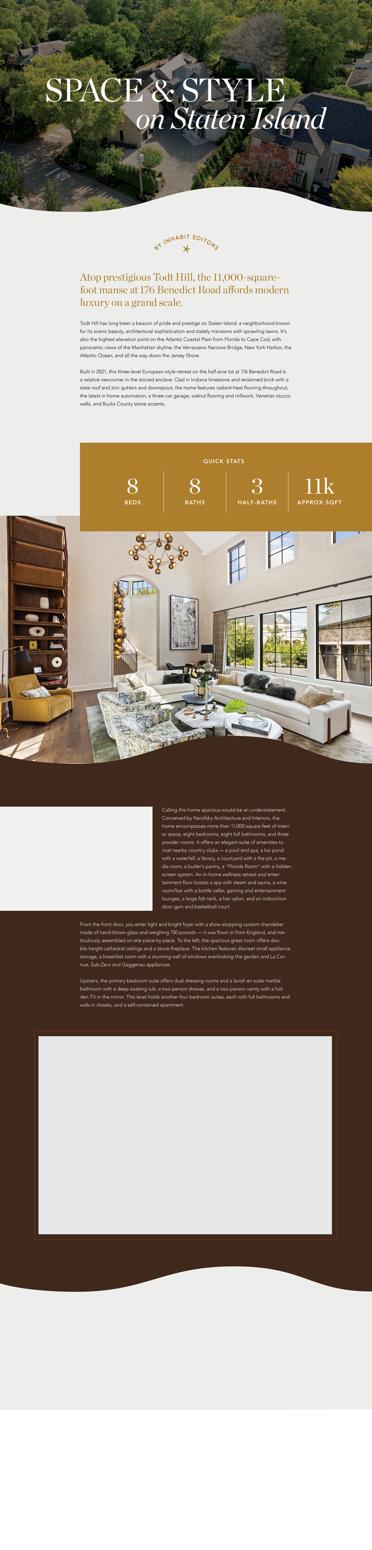 Atop prestigious Todt Hill, the 11,000-square-foot manse at 176 Benedict Road affords modern luxury on a grand scale.